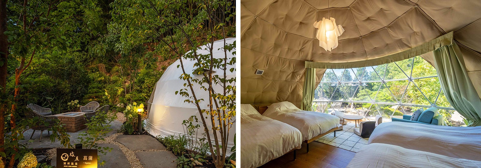 離れのグランピングルームはファイヤーベースと専用庭付き。非日常体験を快適に味わえます。