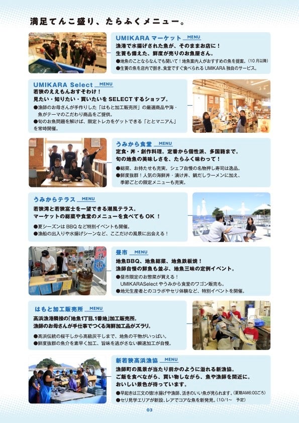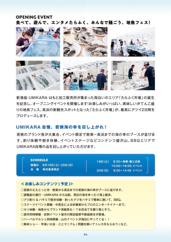 今夏、この新漁協・UMIKARA・はもと加工販売所が集まった海沿いのエリアが、高浜の新観光スポット「若狭高浜たらふく市場」としてスタートします。美味しい、楽しい、欲しい 、そして海や山の自然、漁師町ならではの優しさが“たらふく”感じられる、海辺のエンタメ市場です。