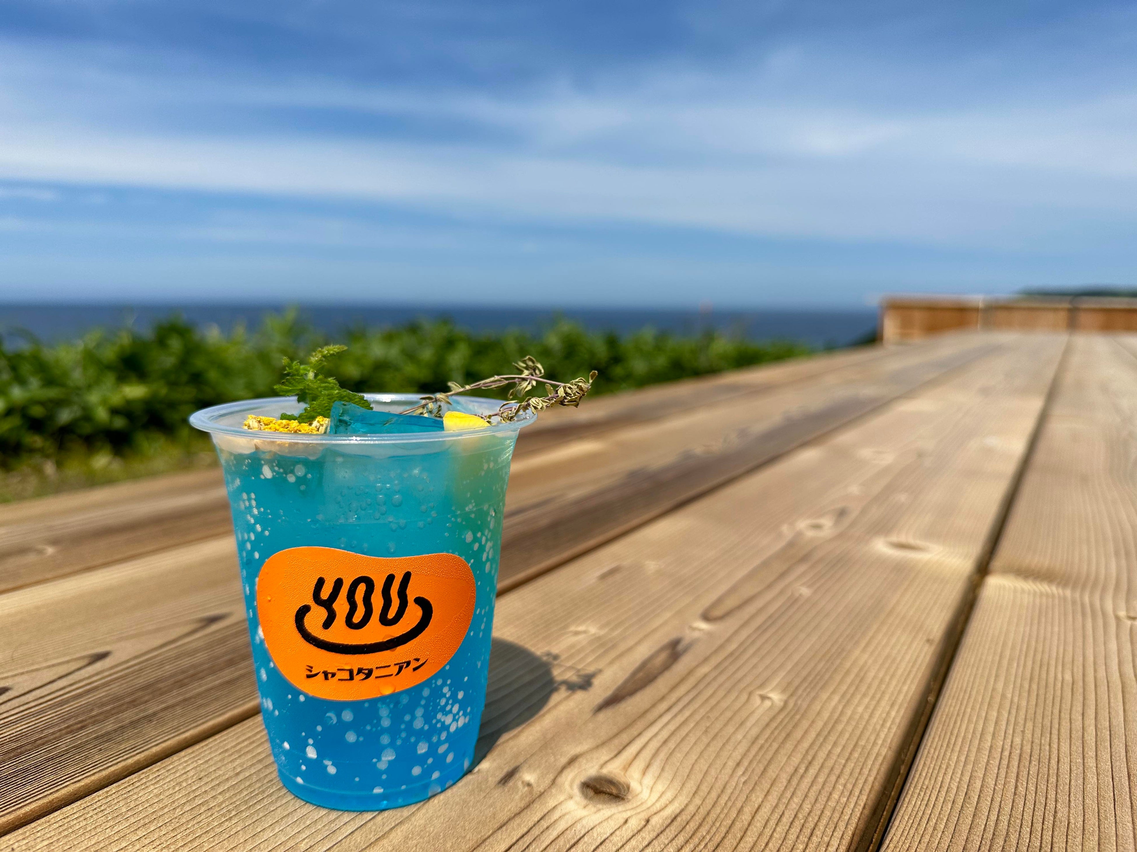 【新規オープン】岬の湯しゃこたんに、日本海を望むウッドデッキテラス「夕日テラス」が完成し、新商品としてテイクアウト可能なボタニカルドリンク「積丹ブルー販売を開始します!