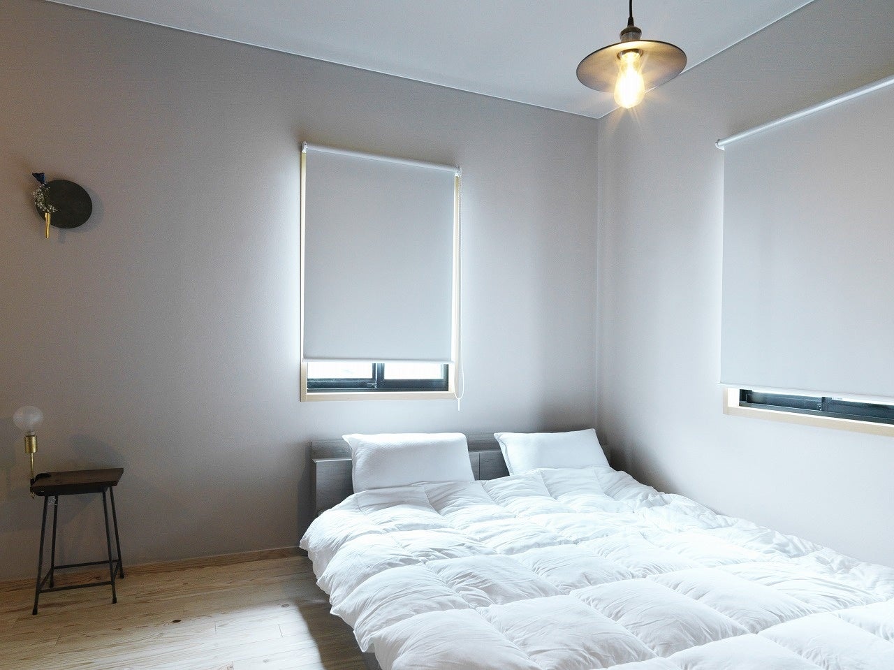寝室は2部屋用意。館内のフローリングはすべて岡山県産の無垢の間伐杉材を使用しており、木の香りを感じます。