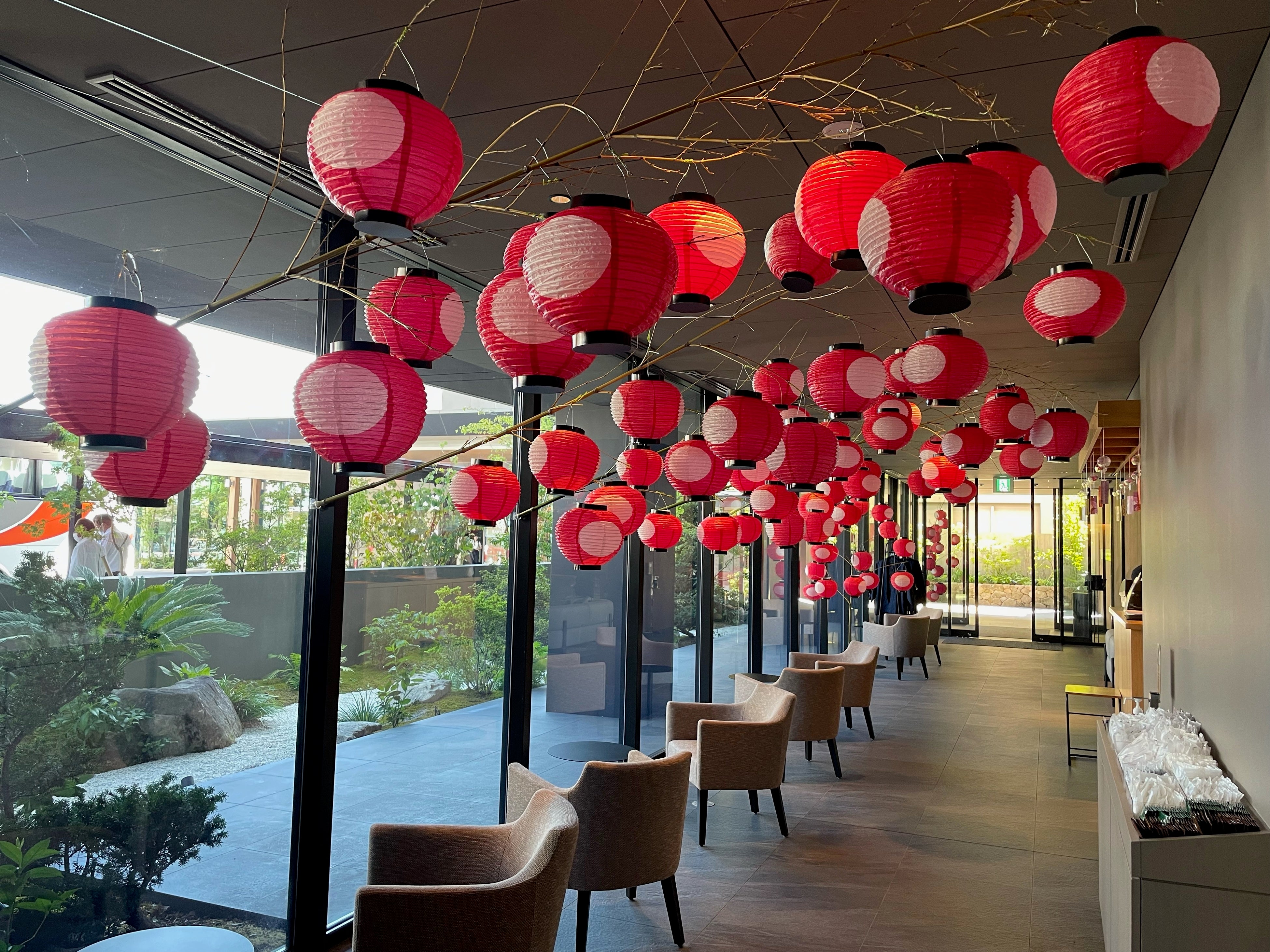 館内には、本物の山口七夕ちょうちん祭りで使用されている提灯が飾られ、夢幻のような空間を創り出します。ロビーに足を踏み入れると、眼前に広がるのは、提灯の優しく温かな光が満ちた異次元の世界。その光が、訪れるお客様一人一人の心を包み込み、温かな雰囲気を届けます。