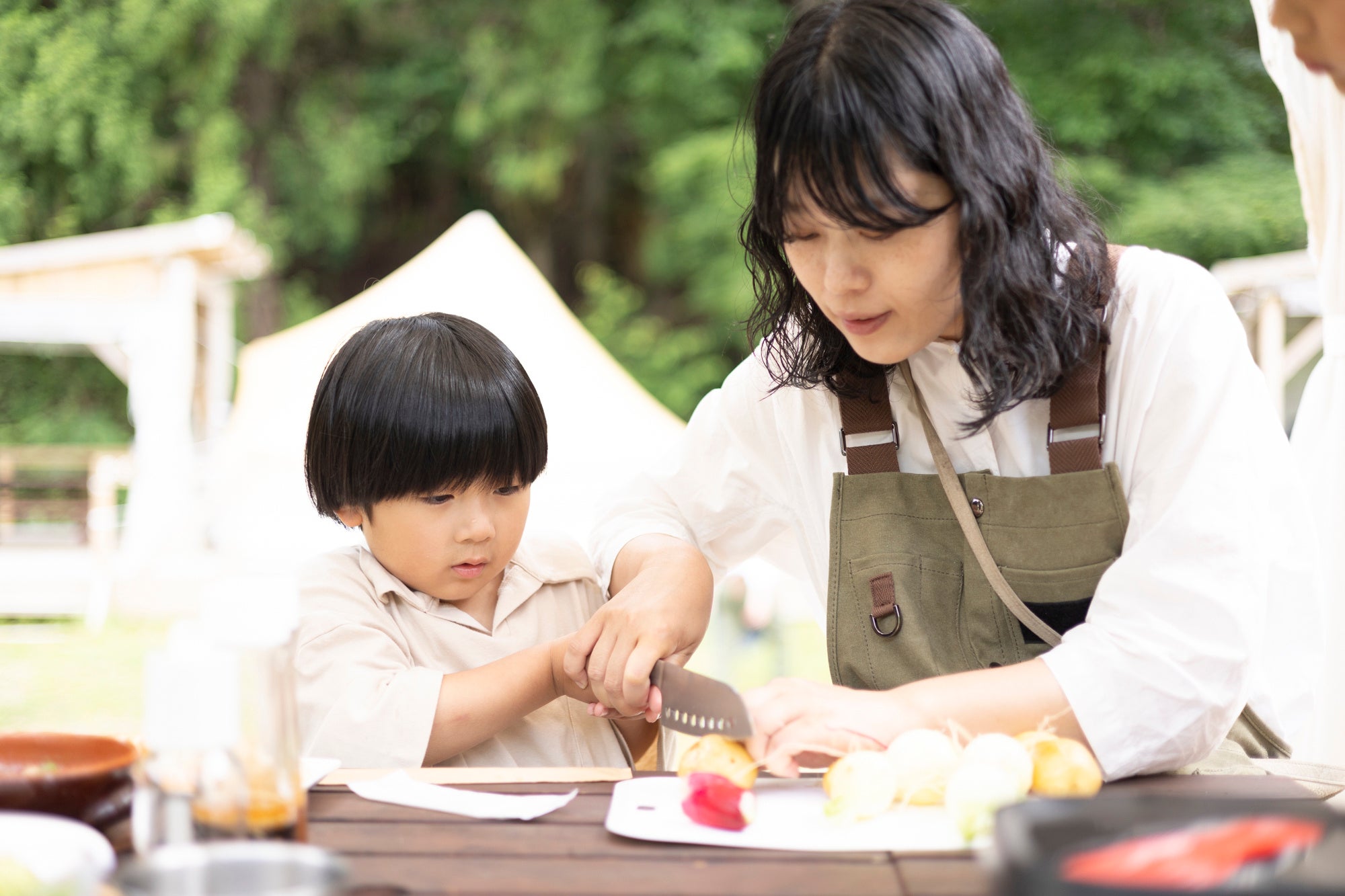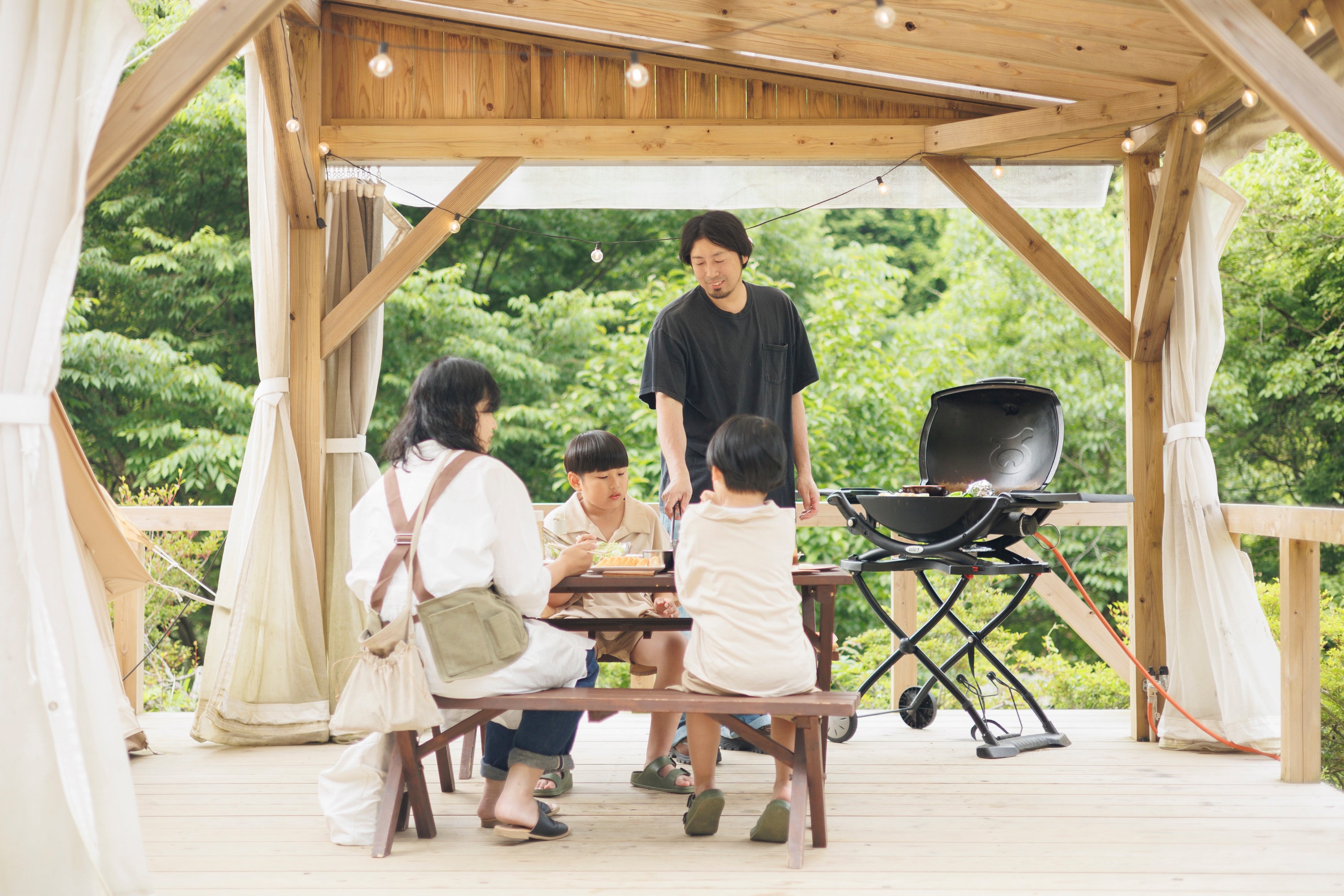 ご夕食のBBQはテント前の屋根のついたウッドデッキや、バンガローのテラスにて、BBQ本場アメリカweber社のガスグリルで夕食をお楽しみいただけます。着火や準備、片付けなどは全てスタッフで行いますので、はじめての方でも心配不要。調味料・お皿もすべて用意しているため、事前に食材や食器を持ってくる必要はありません。また、BBQ用にお好みで調合できる「スパイスソルトづくり」体験も行っています。