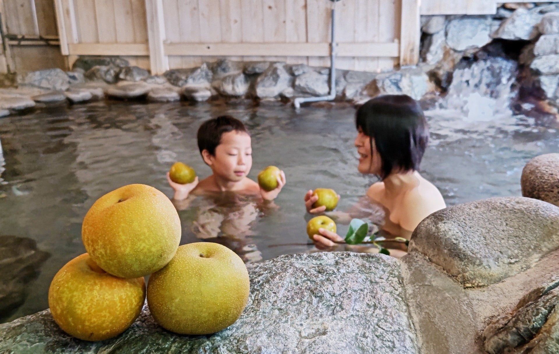 お風呂に浮かべるのは傷がつき出荷できなくなった梨と乾燥させた梨の葉です。使用する梨は埼玉県東松山市にある「けんちゃん梨園」さまにご協力いただきました。