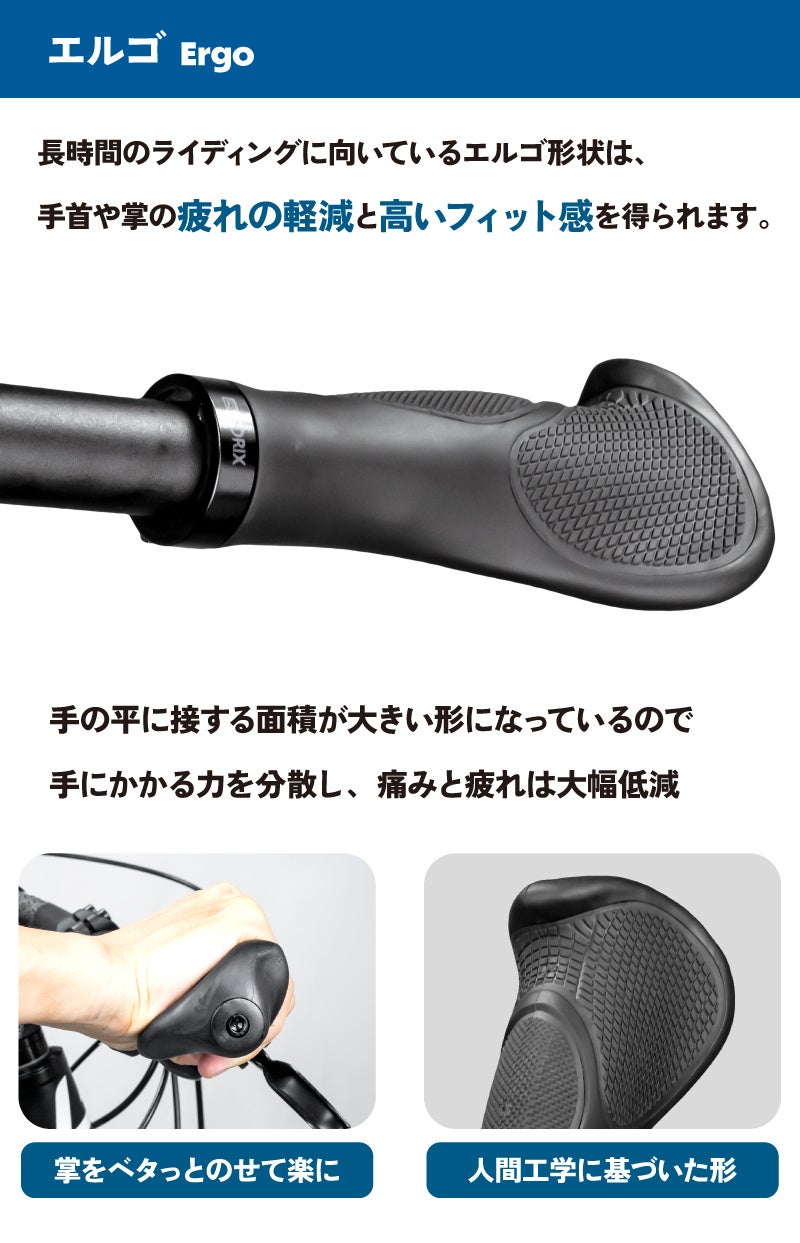 長時間のライディングに向いているエルゴ形状は、手首や掌の疲れの軽減と高いフィット感が期待できます。