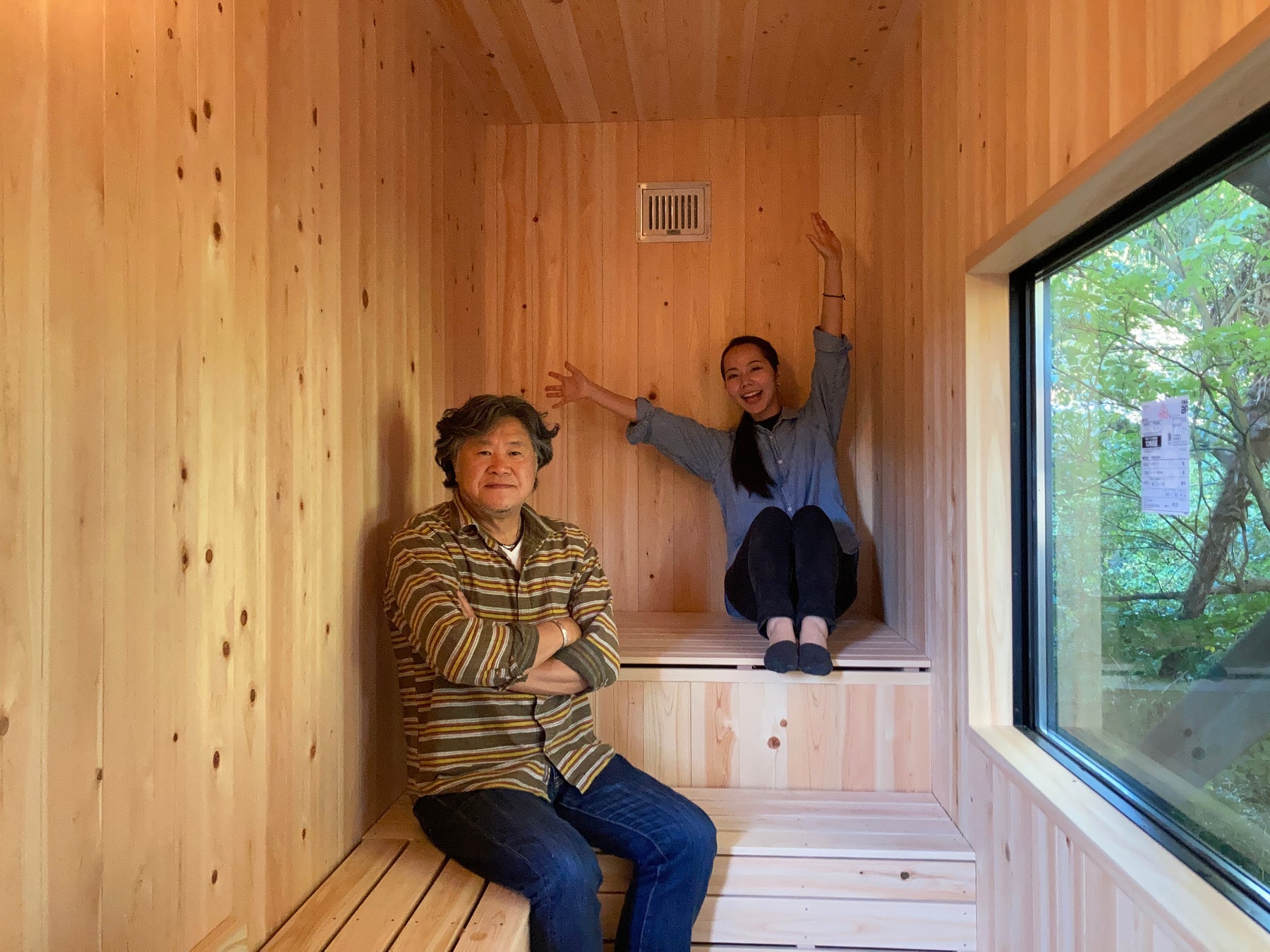室内は全てヒノキ張りで窓ガラス越しに森と川が見えるサウナです。