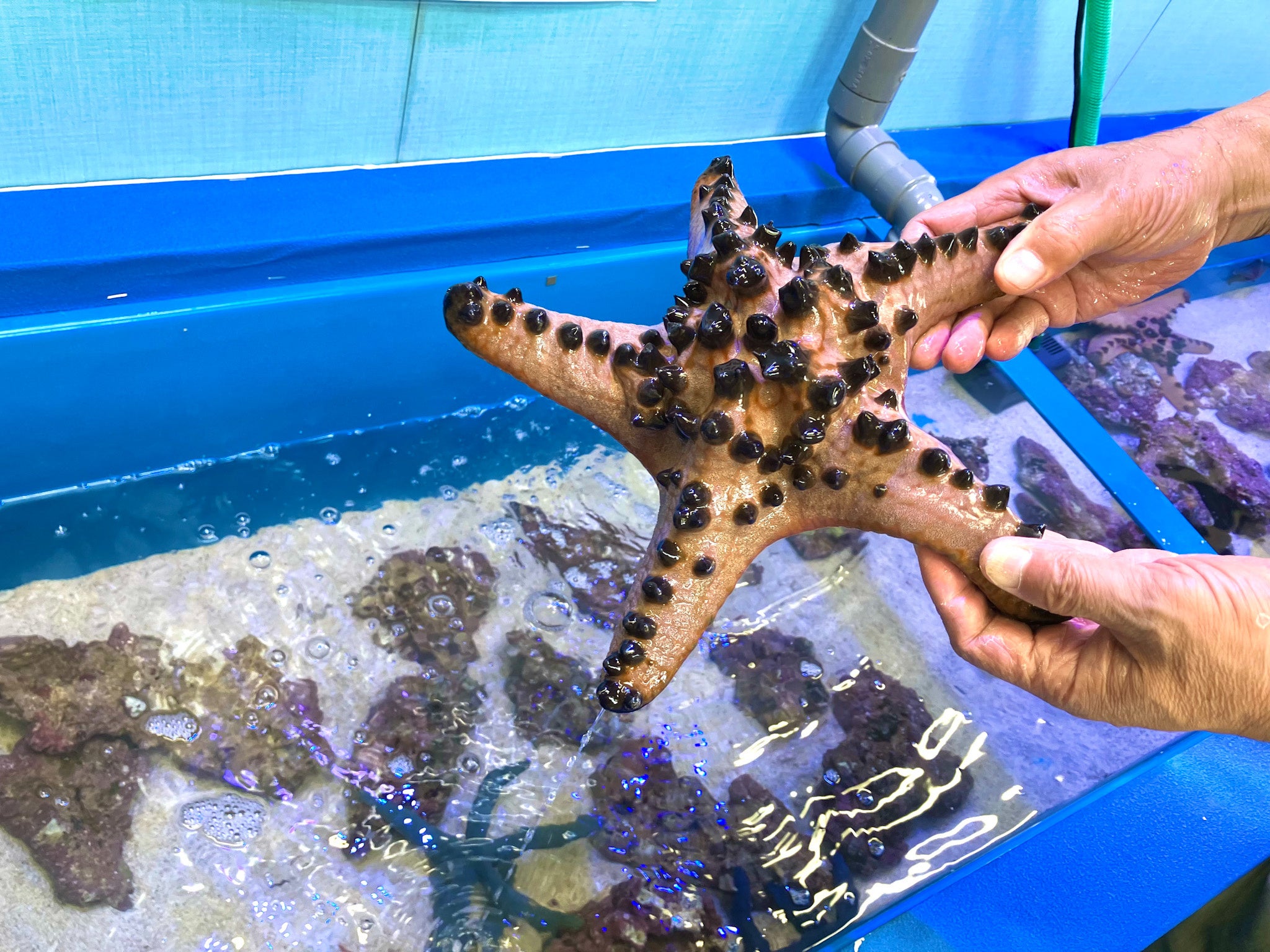 7月20日(木)~8月31日(木)の夏休み期間中には飼育展示室で「タッチングプール」を設置いたします。大人の手よりも大きいコブヒトデやユビワサンゴヤドカリなど、普段出会えない12種類の海の生き物に直接触れることができます。お子様の夏休みの自由研究にもおすすめです。