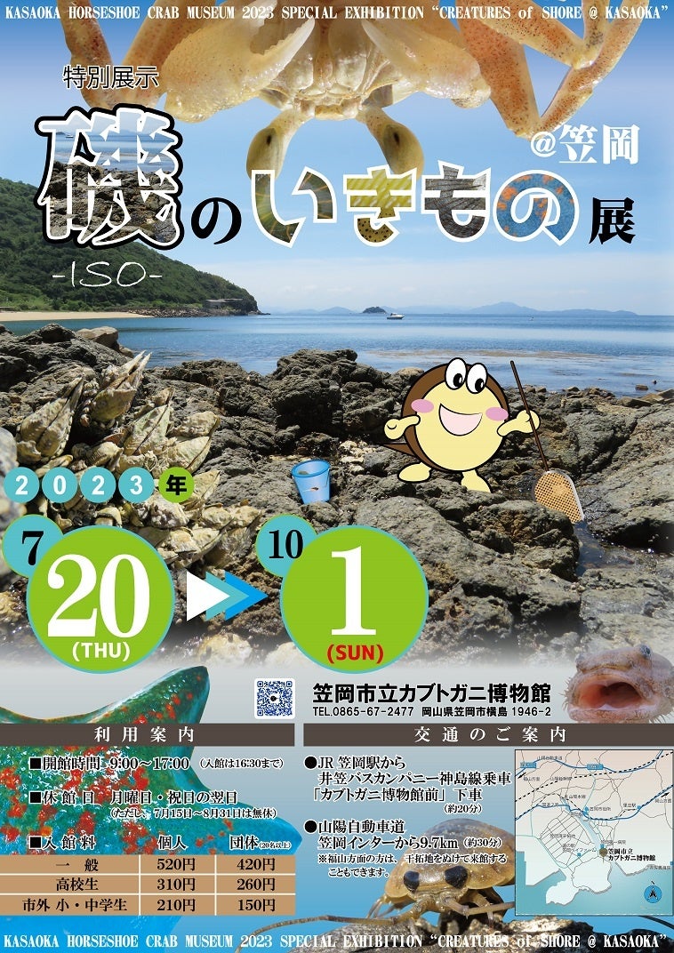 笠岡市立カブトガニ博物館(笠岡市横島1946-2 館長:森信敏)では、7月20日(木)~8月31日(木)の夏休み期間中、ヒトデやヤドカリ、ナマコなど海のいきものに触れるタッチングプールを設置いたします。また、夏の特別展示として7月20日(木)~10月1日(日)まで「磯のいきもの展」を開催いたします。特別展示にあわせて、2023年新作のTシャツやトートバッグなどカブトガニ博物館限定オリジナルグッズも販売いたします。