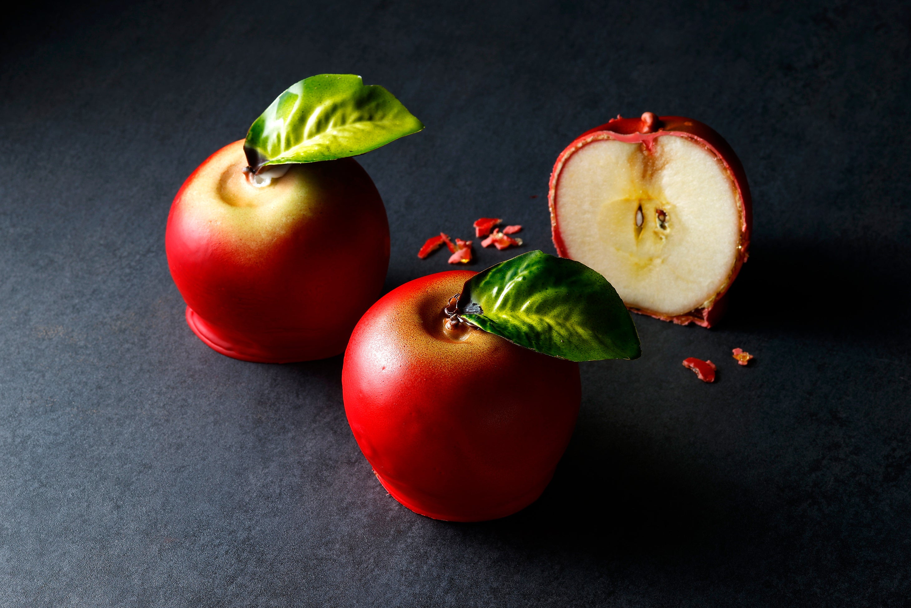 生のりんごに飴をかけ、ホワイトチョコレートでコーティングした今年新発売のスイーツです。ジューシーなりんごの味覚と、チョコレートの甘さと飴の食感の組み合わせをお楽しみいただけます。本物のりんごと見間違えるような赤色のグラデーションと、チョコレート細工でできた緑の葉のデコレーションは、おしゃれなハロウィンギフトにぴったりです。