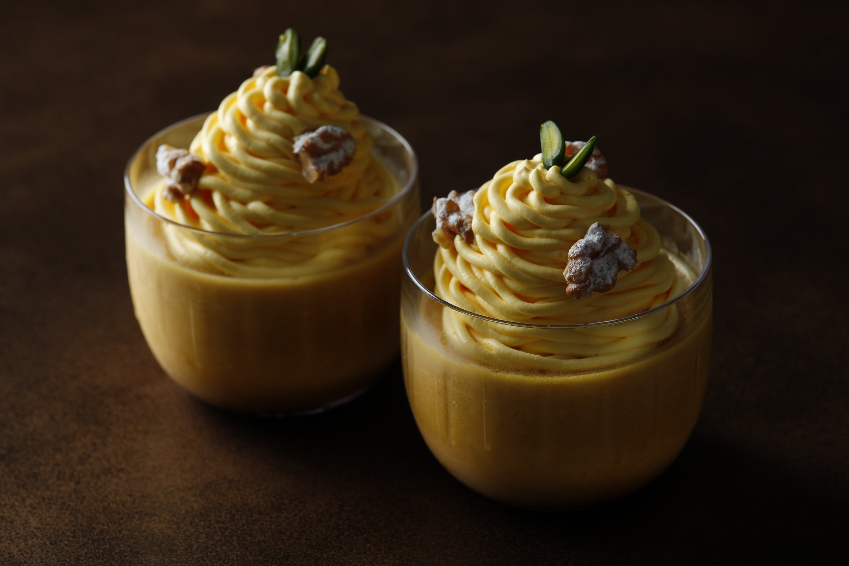 ハロウィンの期間限定でご提供するスイーツ。濃厚なカボチャプリンの上に裏ごししたマロンを乗せ、さつまいものクリームでデコレーションしています。※写真は2022 年バージョン