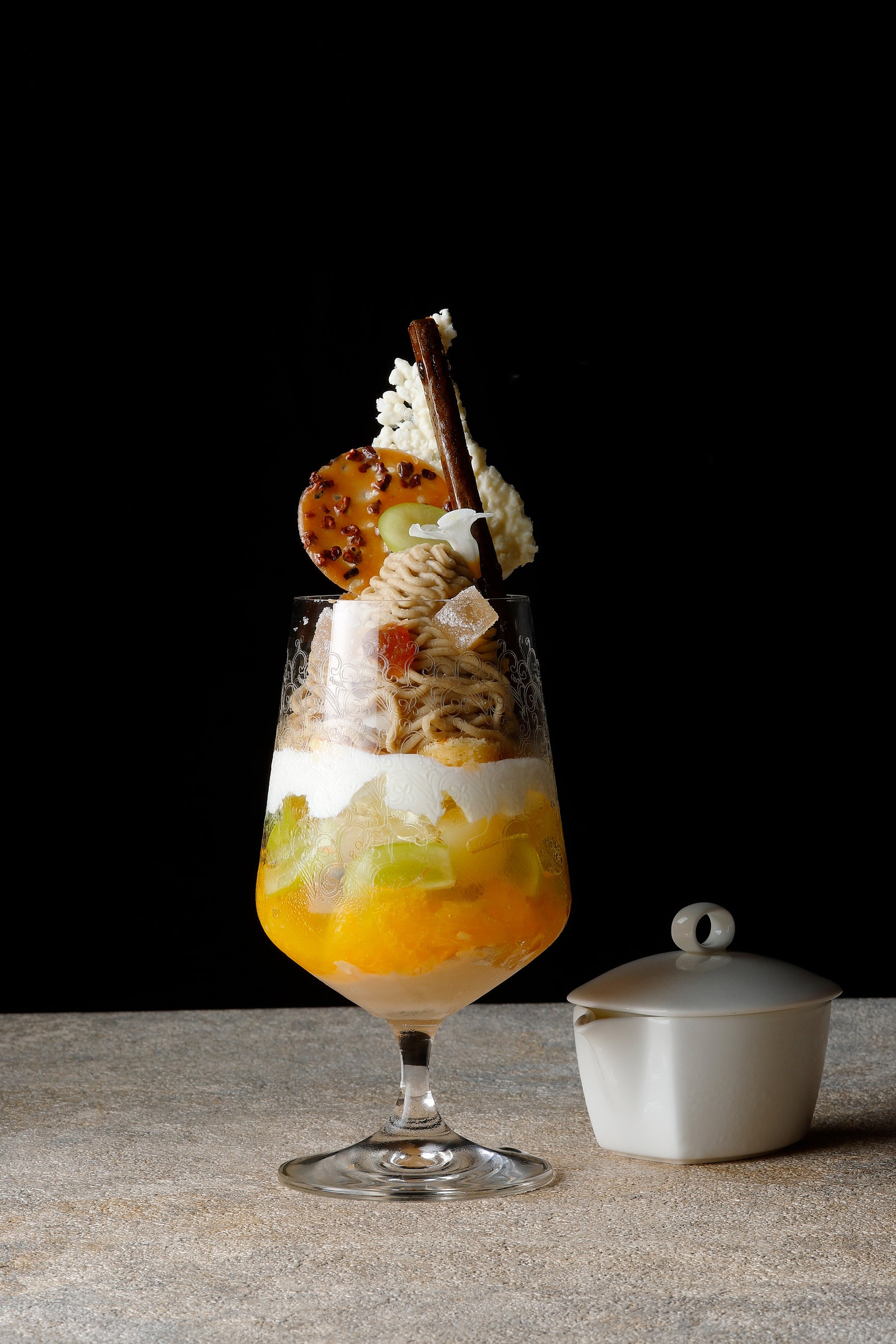 <内容>笠間産新栗のモンブラン、バニラアイスクリーム、フロマージュブランのクリームとケーキ、洋梨、シャインマスカット、オレンジとオレンジソース、スパークリングワインのゼリー、キャラメル風味のヴァローナチョコレートのクリーム、マロングラッセ、洋梨のパートドフリュイ、ホワイトチョコレートのライスパフ、カカオニブ入りチュイル、ほうじ茶のかりんとう