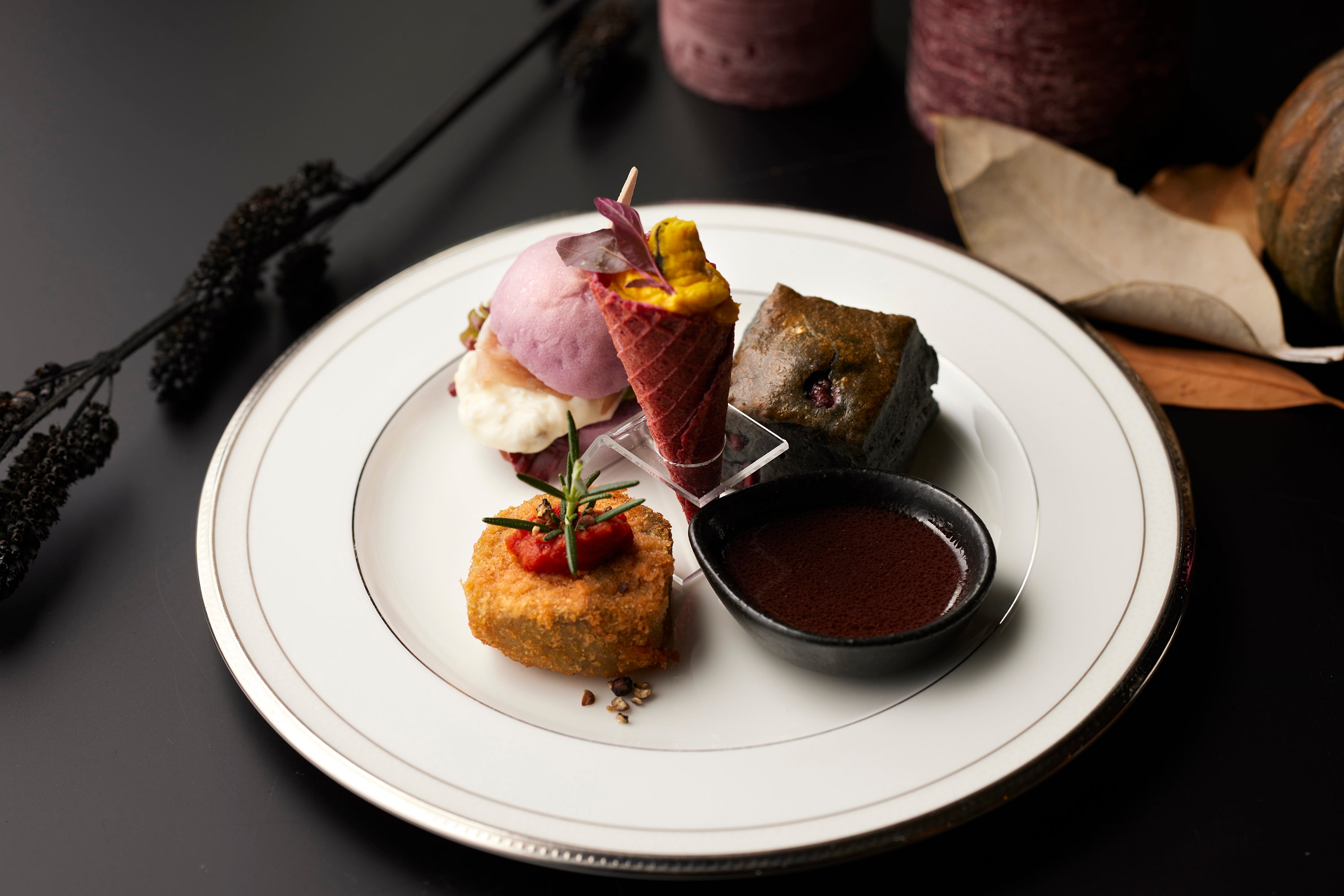 竹炭とざくろのスコーン/アサイーソース/イカスミリゾットコロッケ トマトソース/パンプキンサラダ入りのレッドビートコーン/紫芋と生ハムのタルタルバーガー