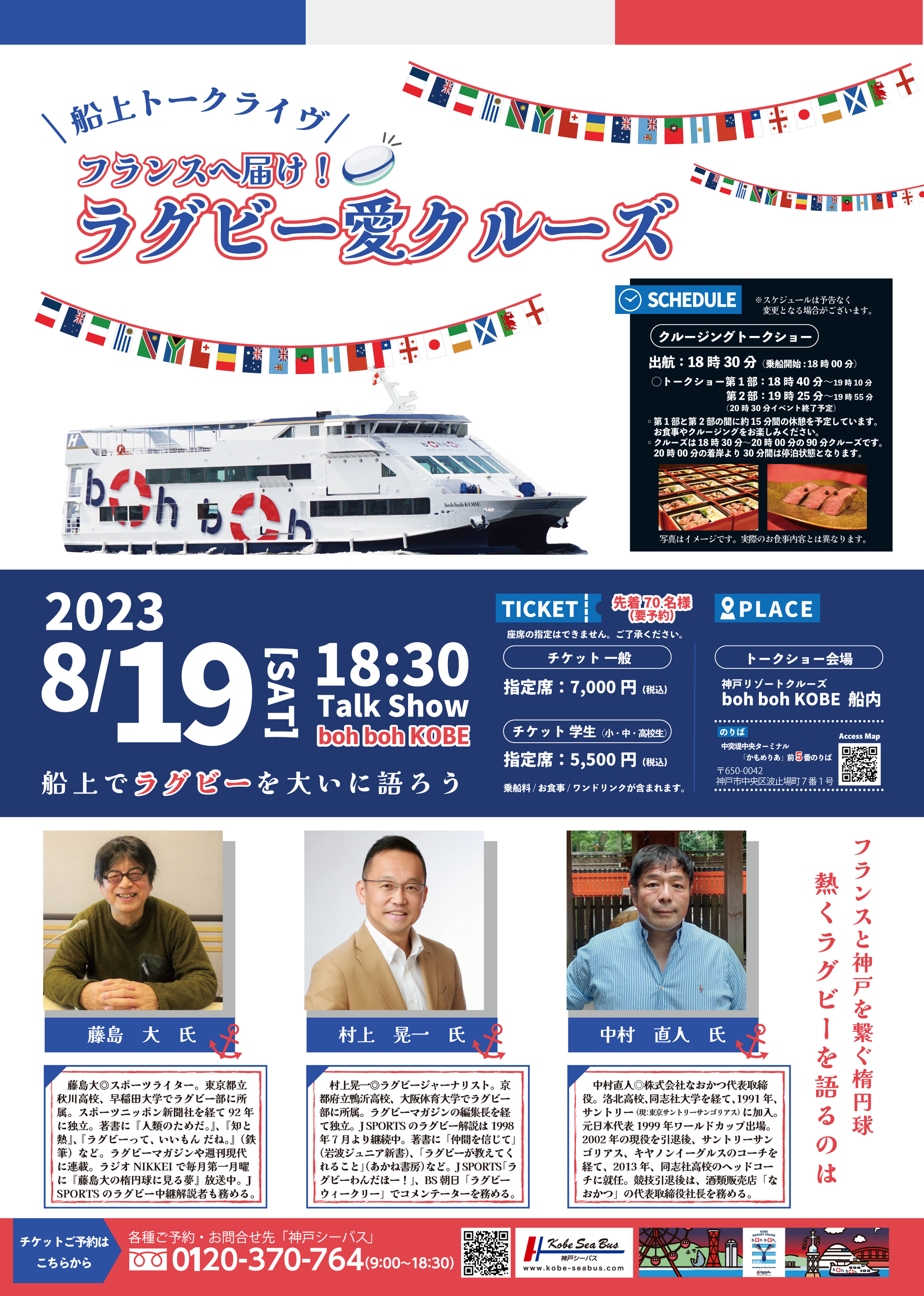 神戸シーバスboh boh KOBEでは8月19日(土)に、船上トークライヴ「フランスへ届け!ラグビー愛クルーズ 船上でラグビーを大いに語ろう!」を開催いたします。予約枠残りわずかとなりました。