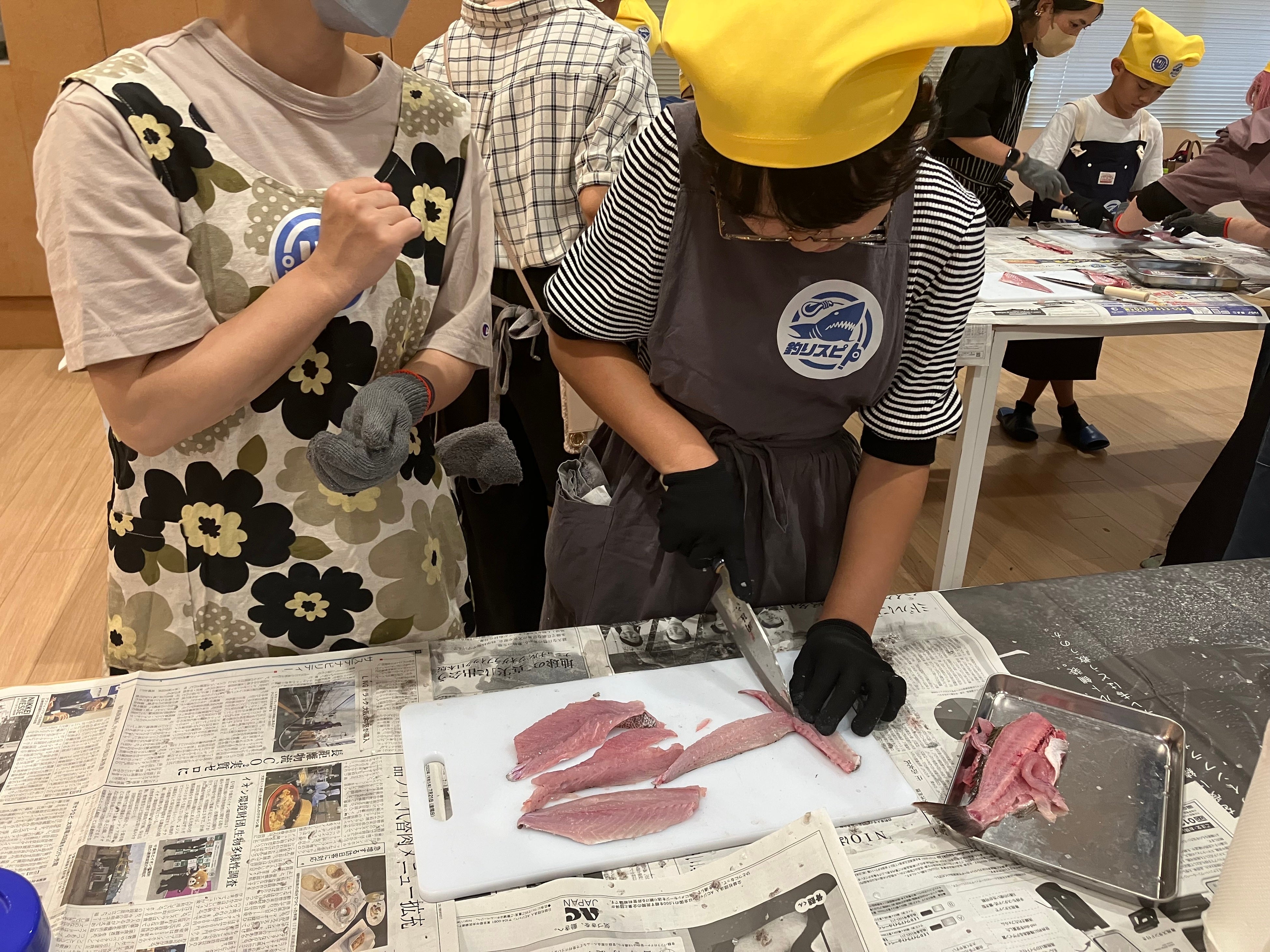 【10:55 魚さばき・調理体験】いよいよ魚さばき体験!イサキの和風ハンバーグと唐揚げを作りました。