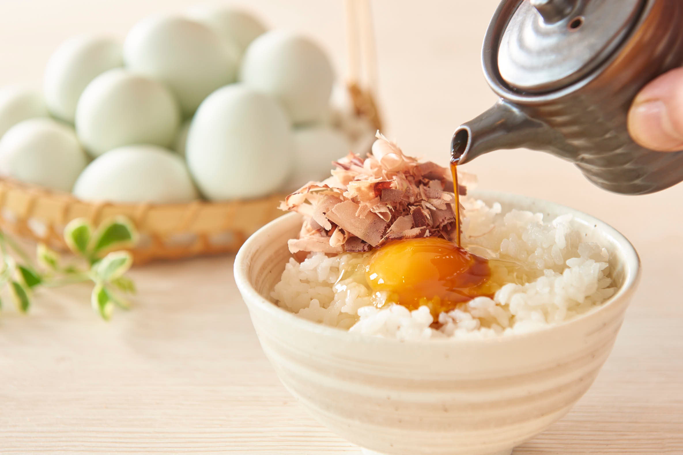 世田谷区で6,000 坪の広大な敷地を持つ「吉実園」から仕入れた、南米原産アローカナが産む「青い卵」を、卵かけごはんでどうぞ。シェフがその場で削る鰹節を乗せて、一緒に食べるのもおすすめです。食欲をそそる香りと、やさしい味をお楽しみください。
