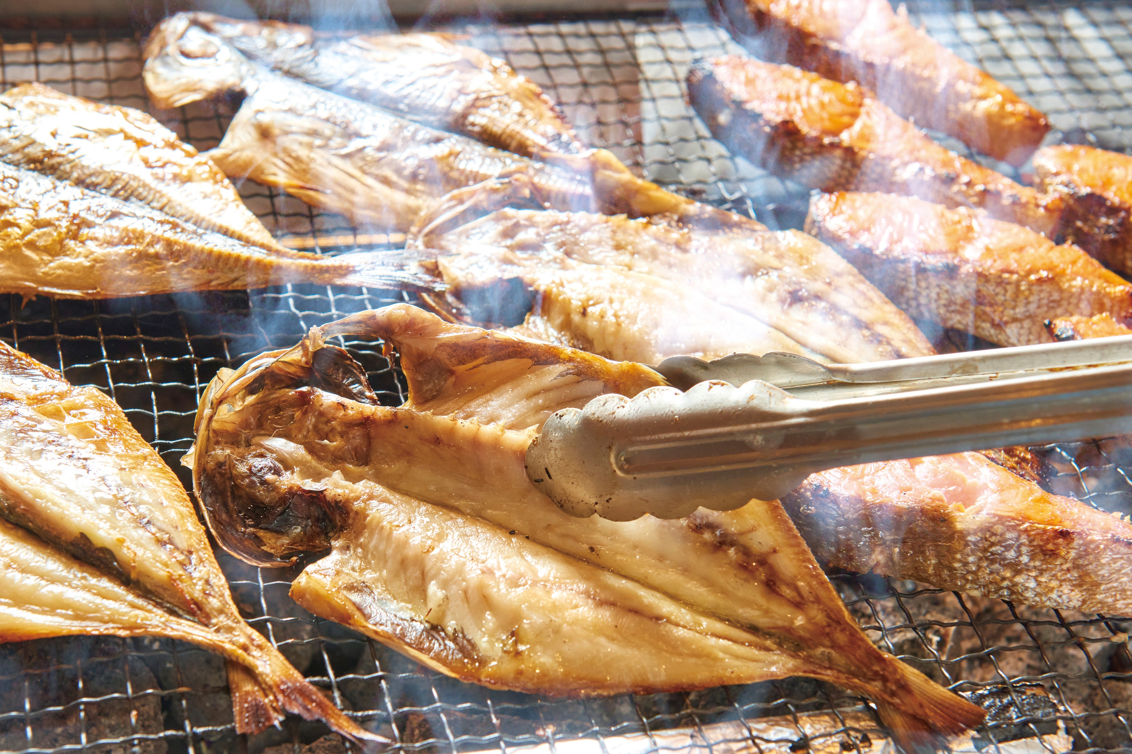 アジの干物と紅鮭を目の前でじっくり焼き、熱々の状態でご用意します。アジの干物は駿河湾でとれたもの。魚を焼くグリルには溶岩石を入れているので、遠赤外線効果でふっくらとした仕上がりに。