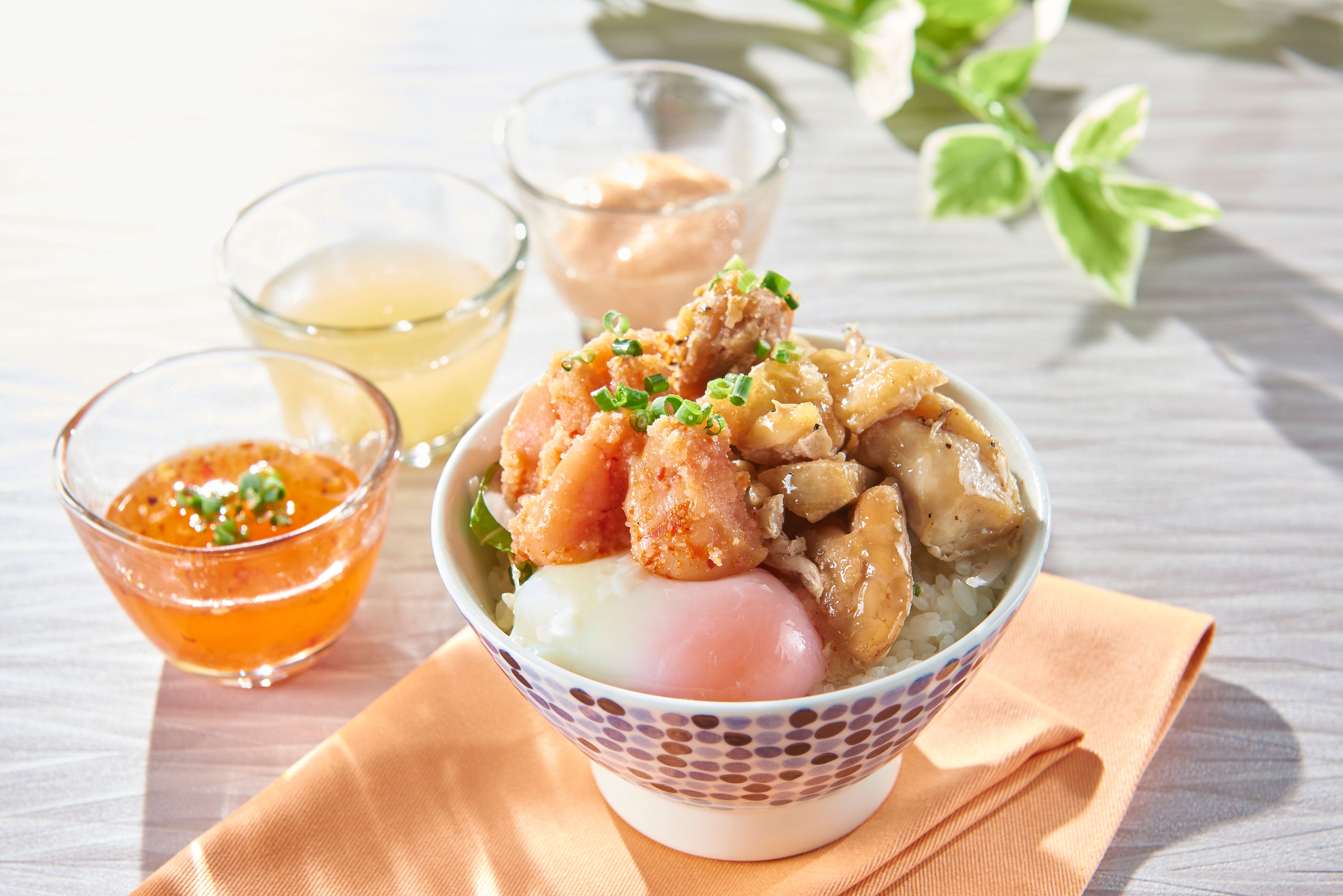 福岡県産米の上に、九州産銘柄鶏の「華味鳥」を使用したチキンローストや明太子、海苔などを乗せたボリュームたっぷりの贅沢な丼。柚子塩ソース、明太ソース、ホットソースの中からお好みのソースを選んで味変を。