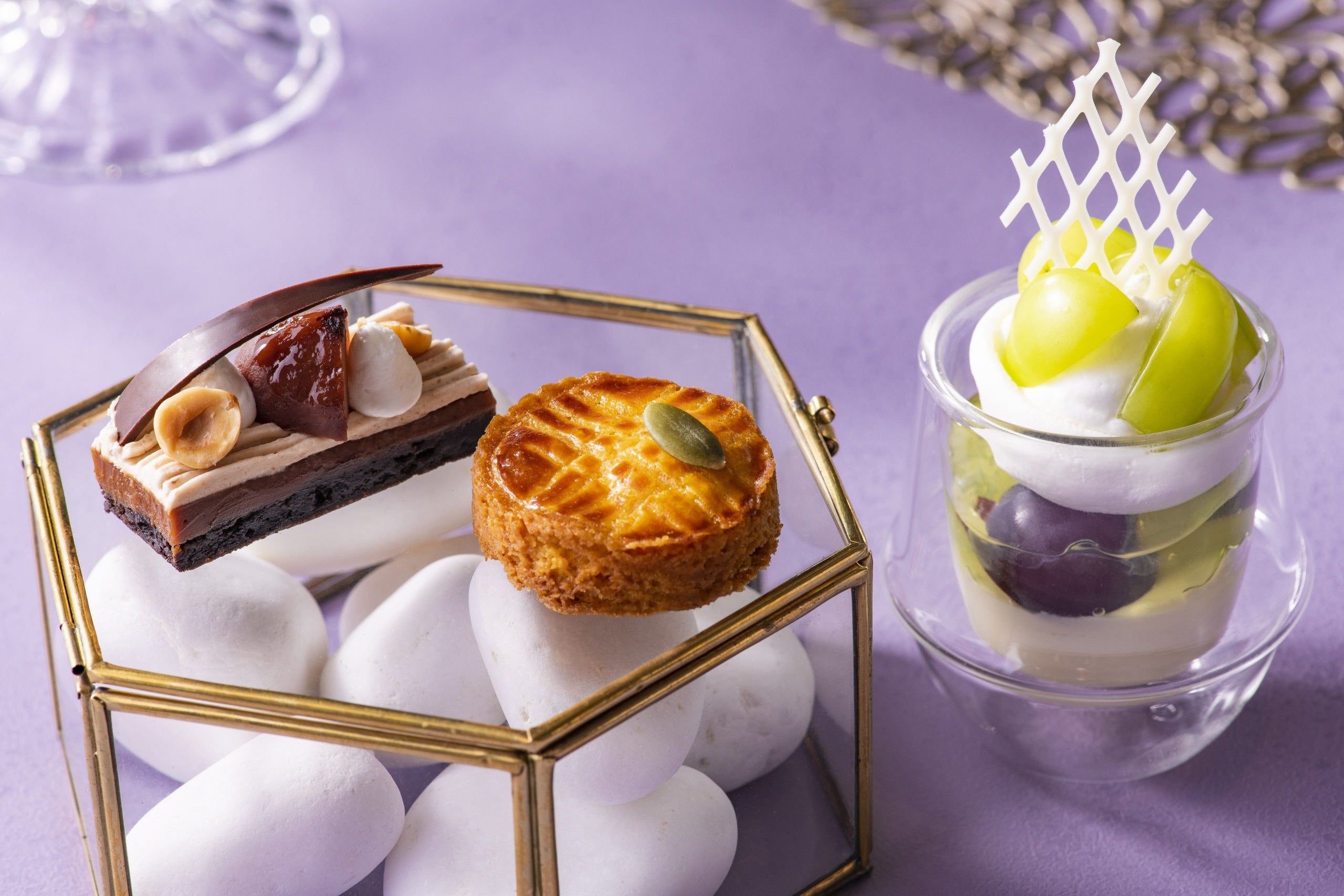 デザートには、たっぷりの巨峰とシャインマスカットをさっぱりしたフロマージュブランと合わせたグラスデザートや、イチジクをトップに飾った、繊細なデザインのイチジクムース、栗とチョコレートを合わせた濃厚で滑らかな舌触りのテリーヌなど、全8種類をご用意しました。