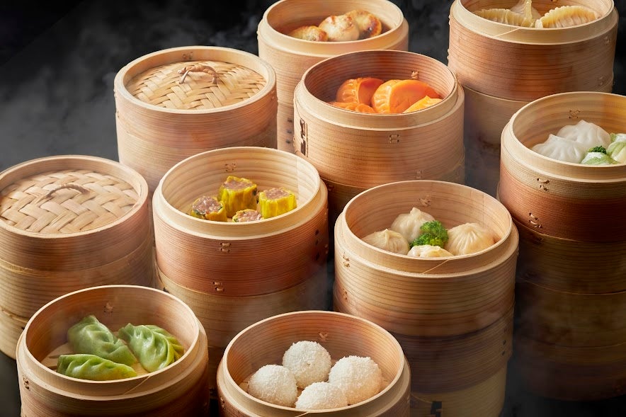 「小籠包」「海老蒸し餃子」「肉焼売」「たこ焼売」「錦糸焼売」「一口肉まん」「叉焼包」「翡翠三角包み」「花咲き 包み蒸し」「春巻き」「五目揚げ餅」「カスタードまん」「桃まん」「ココナツ団子」「胡麻団子」