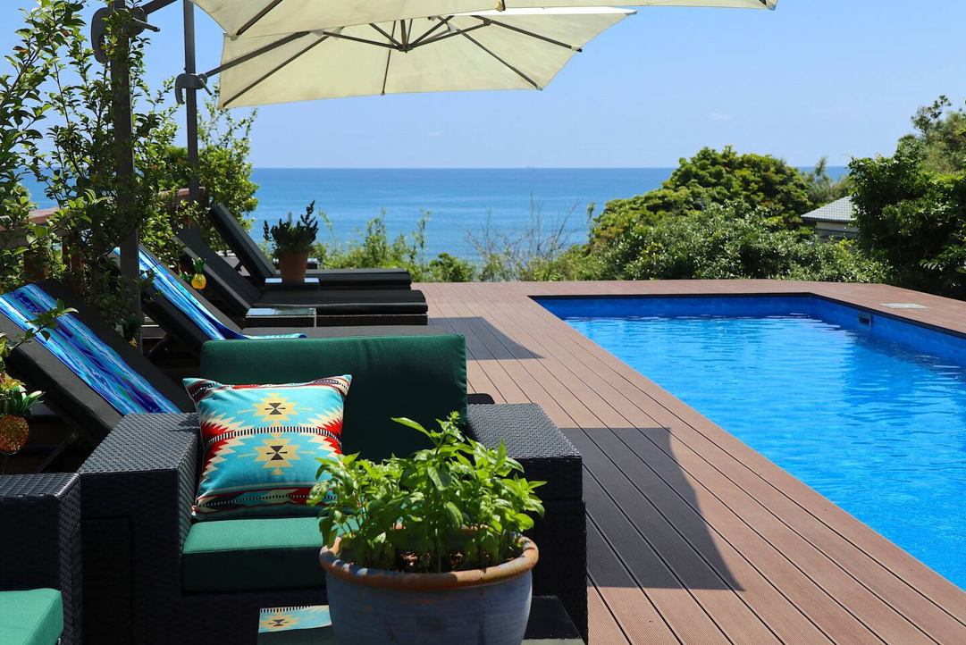 一棟貸しのコテージ。オーシャンビューのリビングは20畳の広さで、15mのプールに野外ジャグジー、焚き火やBBQも楽しめます。プールサイドにはバー、音楽システムも搭載しているので、お気に入りの音楽と海の潮騒に囲まれて、プールでまったりすることも可能です。