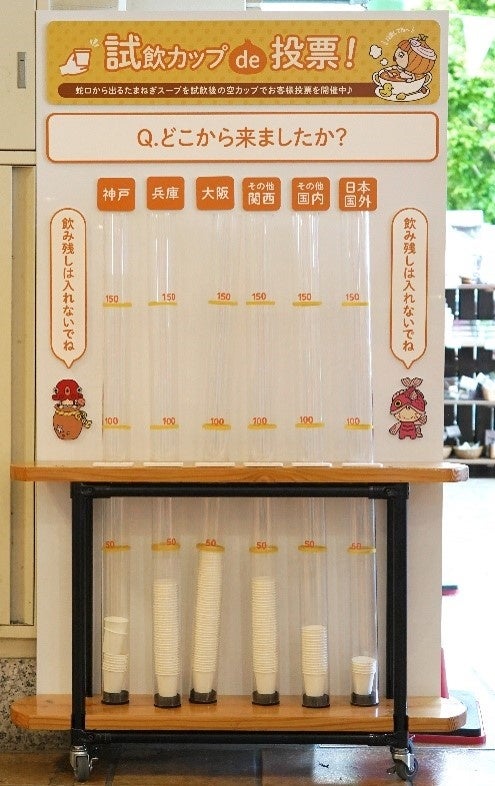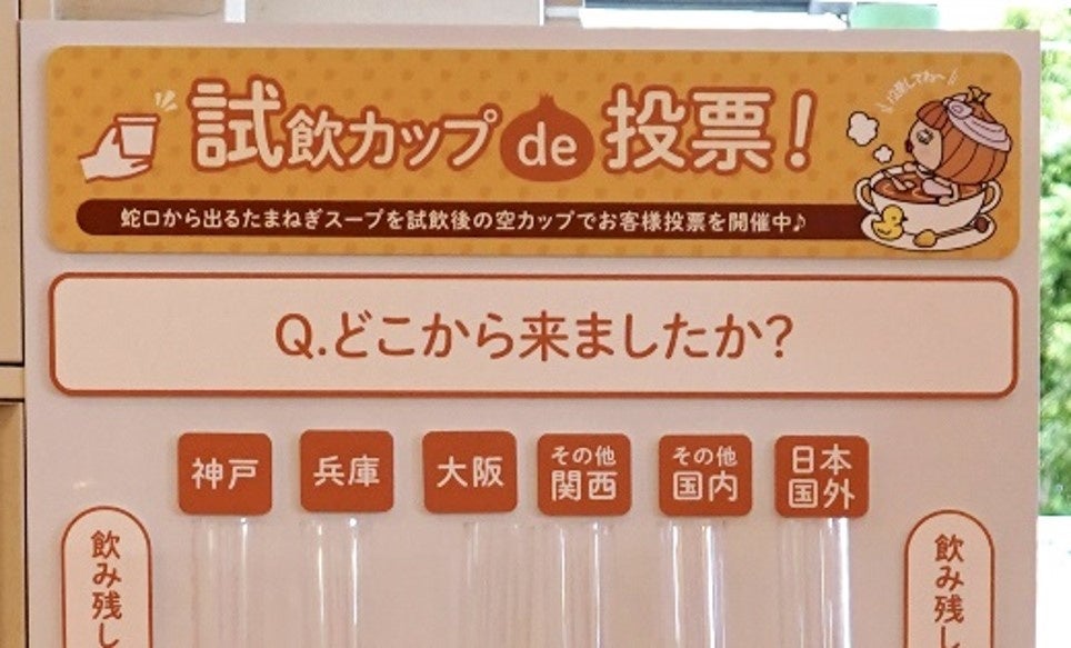 淡路たまねぎスープは、累計販売総数7000万食を誇り、淡路島のお土産の中でもその知名度の高さは抜群です。そのたまねぎスープが試飲できる、淡路たまねぎスープスタンドは、連日長蛇の列となるほど大好評。この人気を活かし、更なるお楽しみの付加として、試飲済カップによる投票を開始することとなりました。
