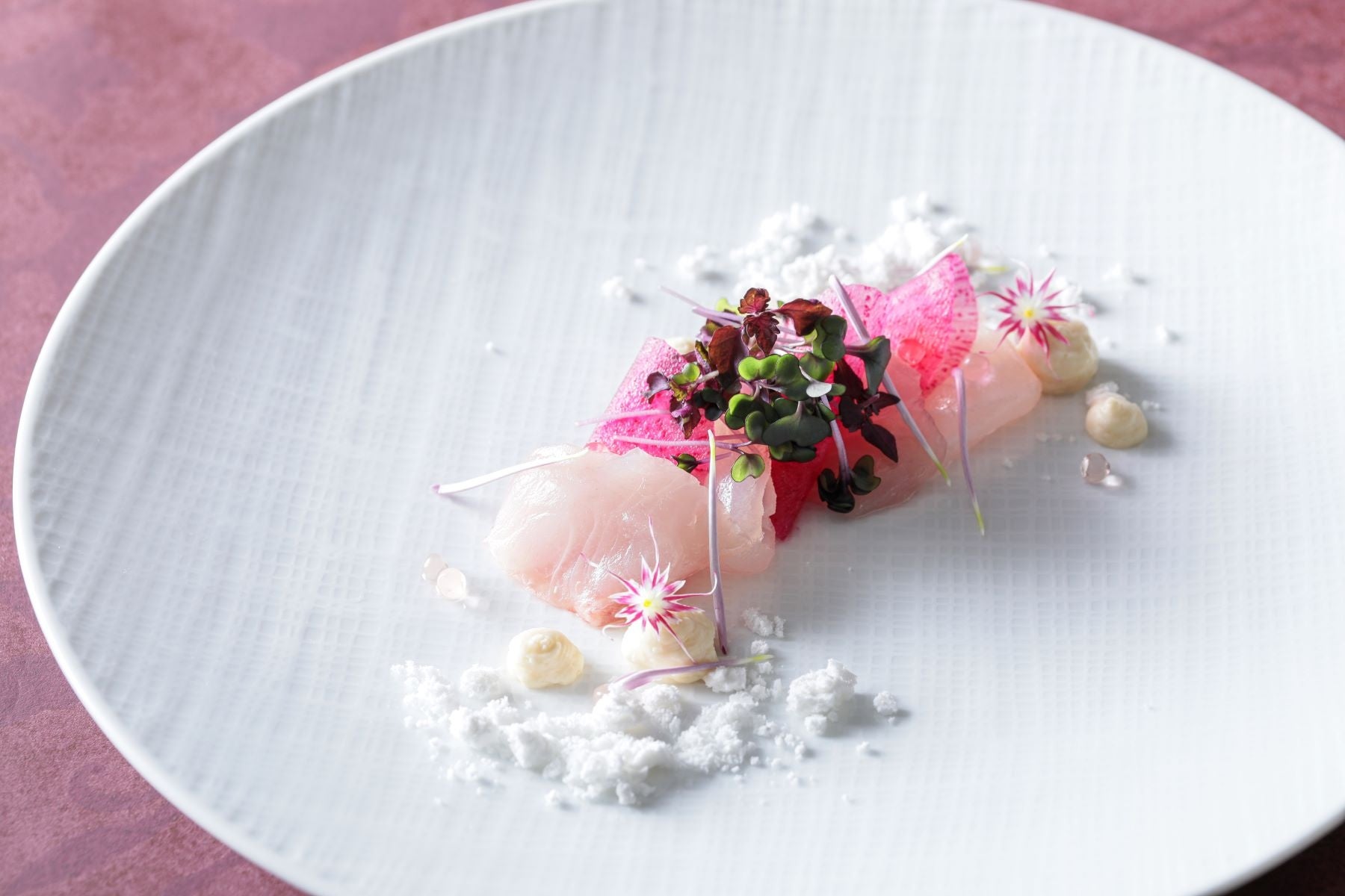 下田産金目鯛と真鯛のマリネ グレープフルーツルビーのムースリーヌとピンクバルサミコのアクセント