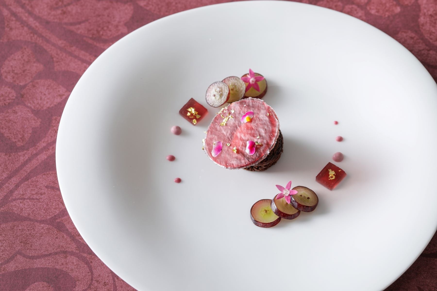 「季節ならではの美味しいものを」をコンセプトとし、今回は静岡県下田産の“金目鯛”や秋の味覚“栗”など、秋に美味しい食材を中心に使用。また、チョコレートコスモスをイメージし、デザートには甘みと苦みのバランスが絶妙な自家製ショコラを使用したスフレに、葡萄の酸味が効いたチュイルを添えた一品に。
