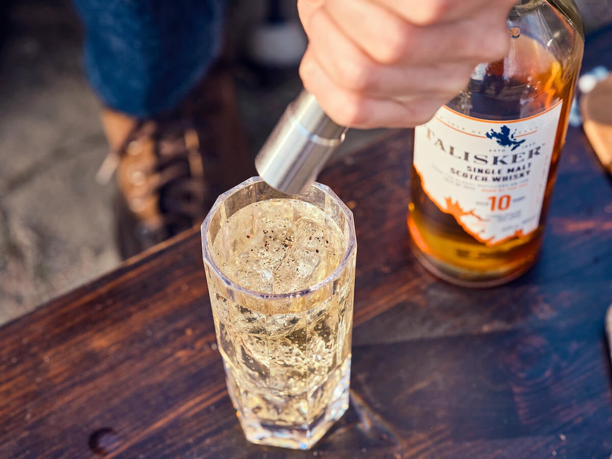 タリスカーのハイボールに黒胡椒を振りかけた「スパイシーハイボール」は、潮風と黒胡椒の香り、スモーキーな味わいをさらに際立たせ、最高の食中酒となります。