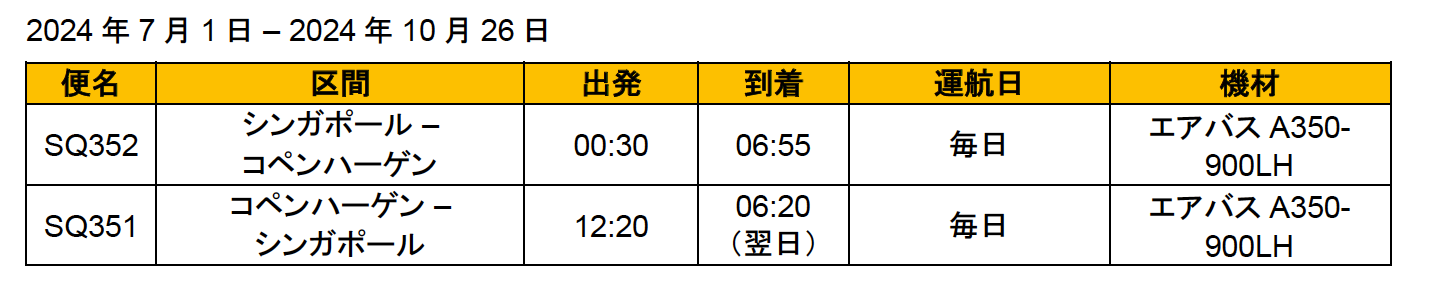 2024年7月1日より、シンガポール – コペンハーゲン間(SQ352便、SQ351便)をエアバスA350-900長距離(A350-900LH)型機で運航し、これにより現在の週5便からパンデミック前と同じデイリー運航に復便します。