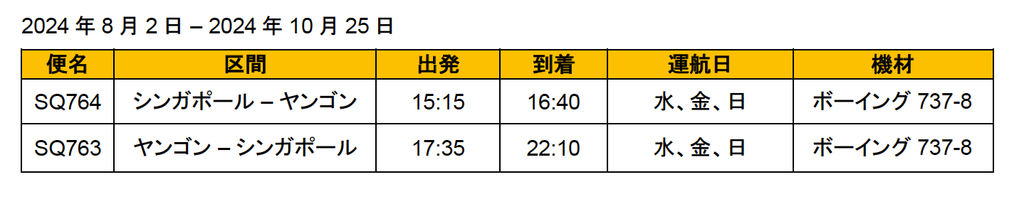 シンガポール – ヤンゴン間(SQ764便、SQ763便)は、2024年8月2日よりボーイング737-8型機で週3便増便する予定です。これにより両都市間は、週7便から週10便に増便します。