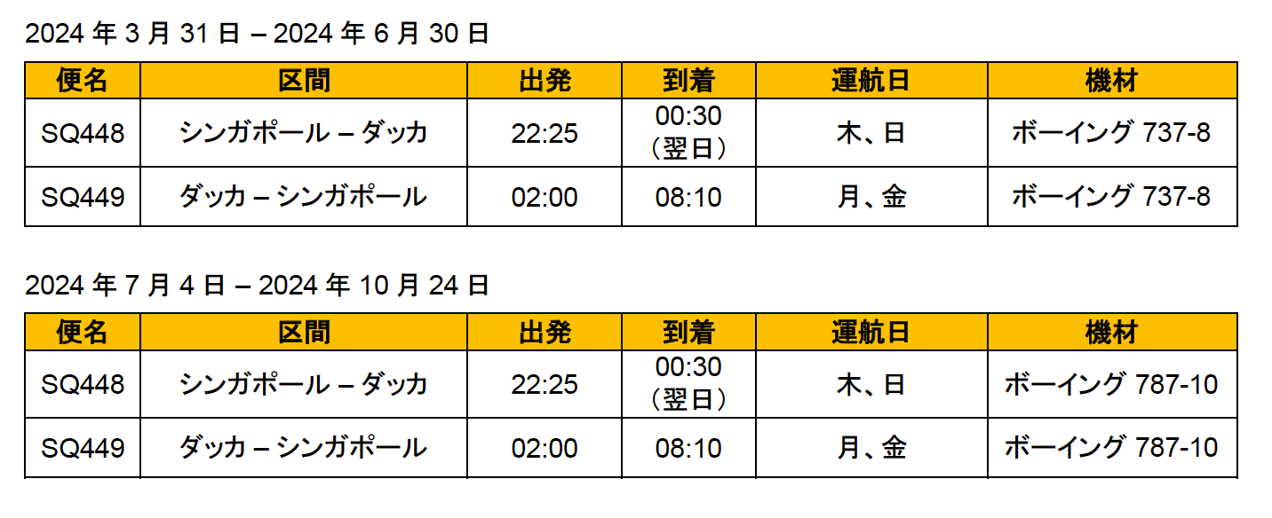 2024年3月31日より、シンガポール – ダッカ間(SQ448便、SQ449便)を週2便増便します。これにより、シンガポール – ダッカ間は週7便から週9便となります。
