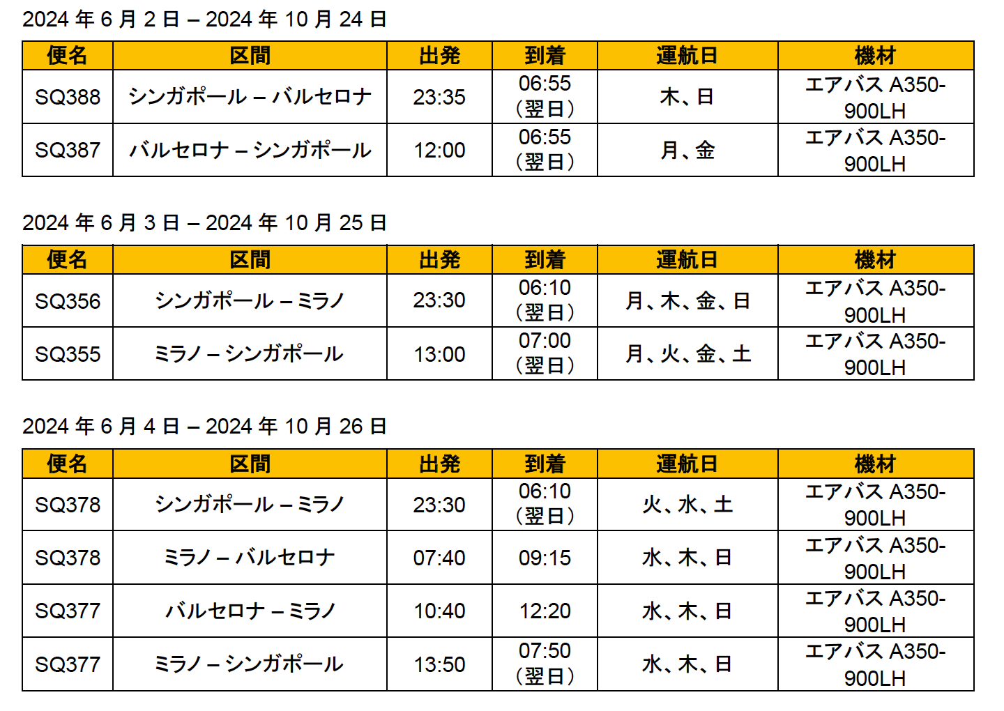 2024年6月2日からシンガポール – バルセロナ間(SQ388便、SQ387便)の直行便を再開し、週2便運航します。またシンガポール – ミラノ間(SQ356便、SQ355便)の直行便は週2便から週4便に増便します。以遠権フライトであるシンガポール – ミラノ – バルセロナ路線のSQ378便、SQ377便は週5便から週3便の運航になる予定です。