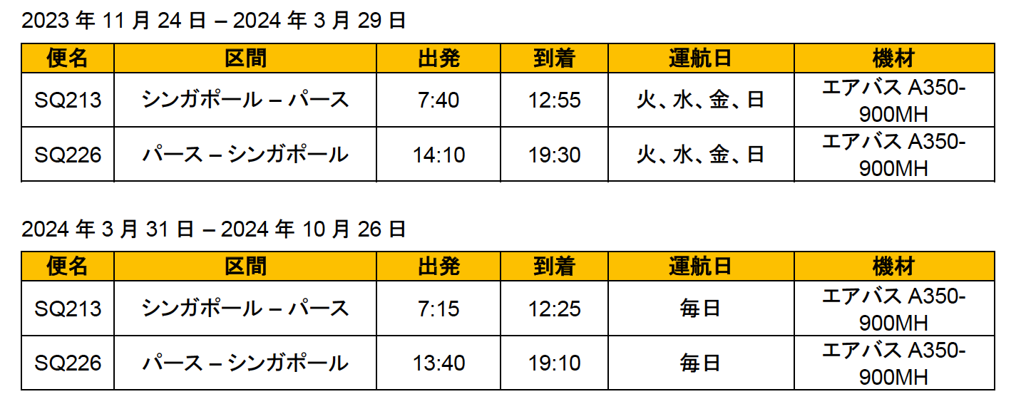 シンガポール – パース間(SQ213便、SQ226便)は、2023年11月24日より週4便増便します。2024年3月31日からは毎日運航となり、いずれの期間もエアバスA350-900 中距離(A350-900MH)型機で運航します。同路線はパンデミック前と同じ毎日4便の運航に復便します。