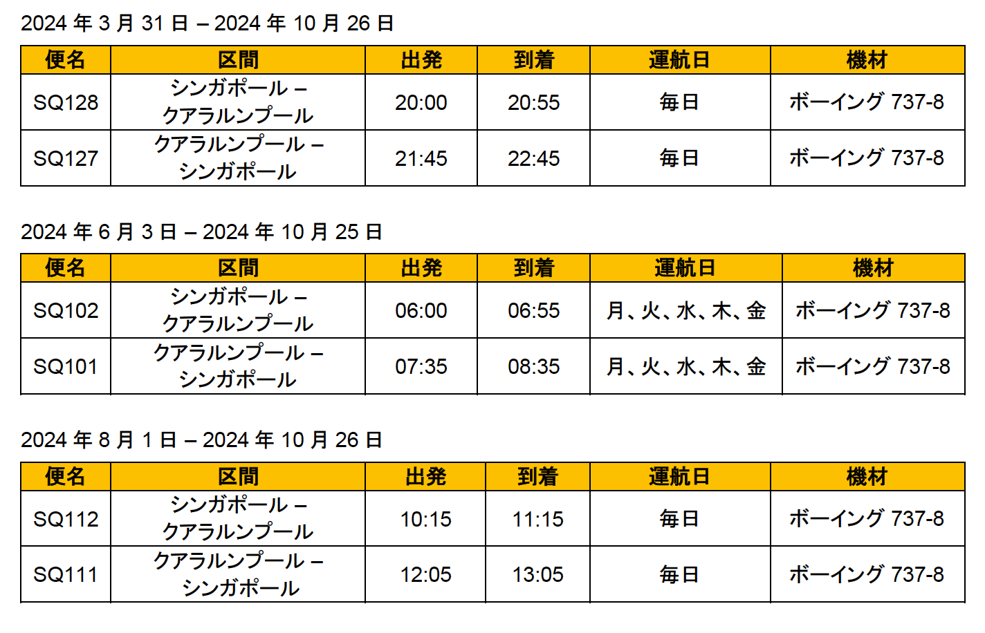 2024年夏期スケジュールよりシンガポール – クアラルンプール間は、週47便から週66便へ増便します。2024年3月31日より両都市間のデイリー運航を追加(SQ128便、SQ127便)。2024年6月3日からは週5便(SQ102便、SQ101便)、2024年8月1日からは追加でデイリー運航(SQ112便、SQ111便)が増便されます。これらのフライトは、ボーイング737-8型機で運航する予定です。
