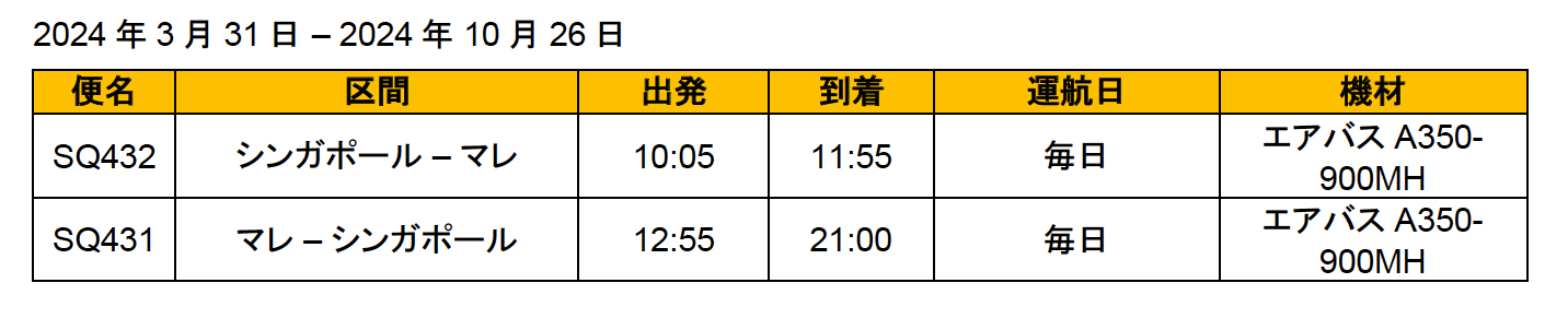 シンガポール – マレ間(SQ432便、SQ431便)は、高まる休暇の需要に対応するため2024年3月31日より現在のナローボディ機ボーイング737-8型機から機材を座席数の多いA350-900中距離(A350-900MH)型機へ変更し、毎日運航する予定です。