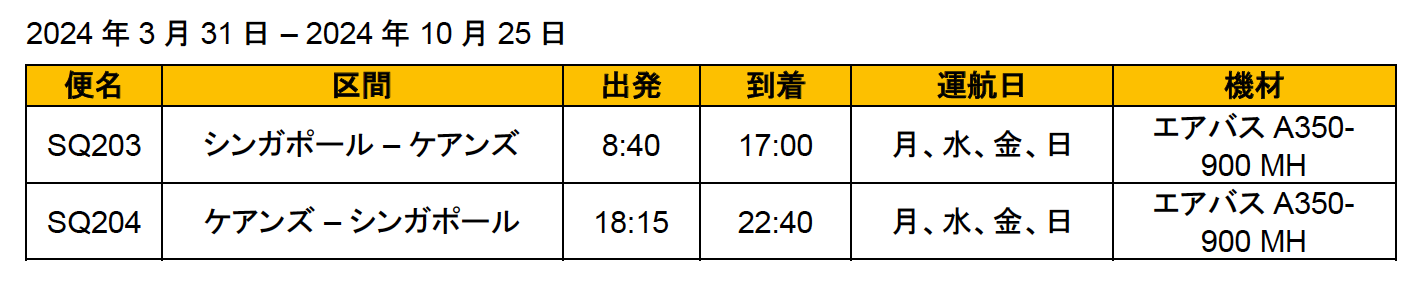 シンガポール – ケアンズ間は現在SQ203便とSQ204便で週5便運航しています。2024年3月31日より、機材をナローボディのボーイング737-8型機から同路線では20年以上ぶりとなるワイドボディ機で従来より大きな機材のエアバスA350-900 中距離(A350-900MH)型機に変更し週4便を運航します。