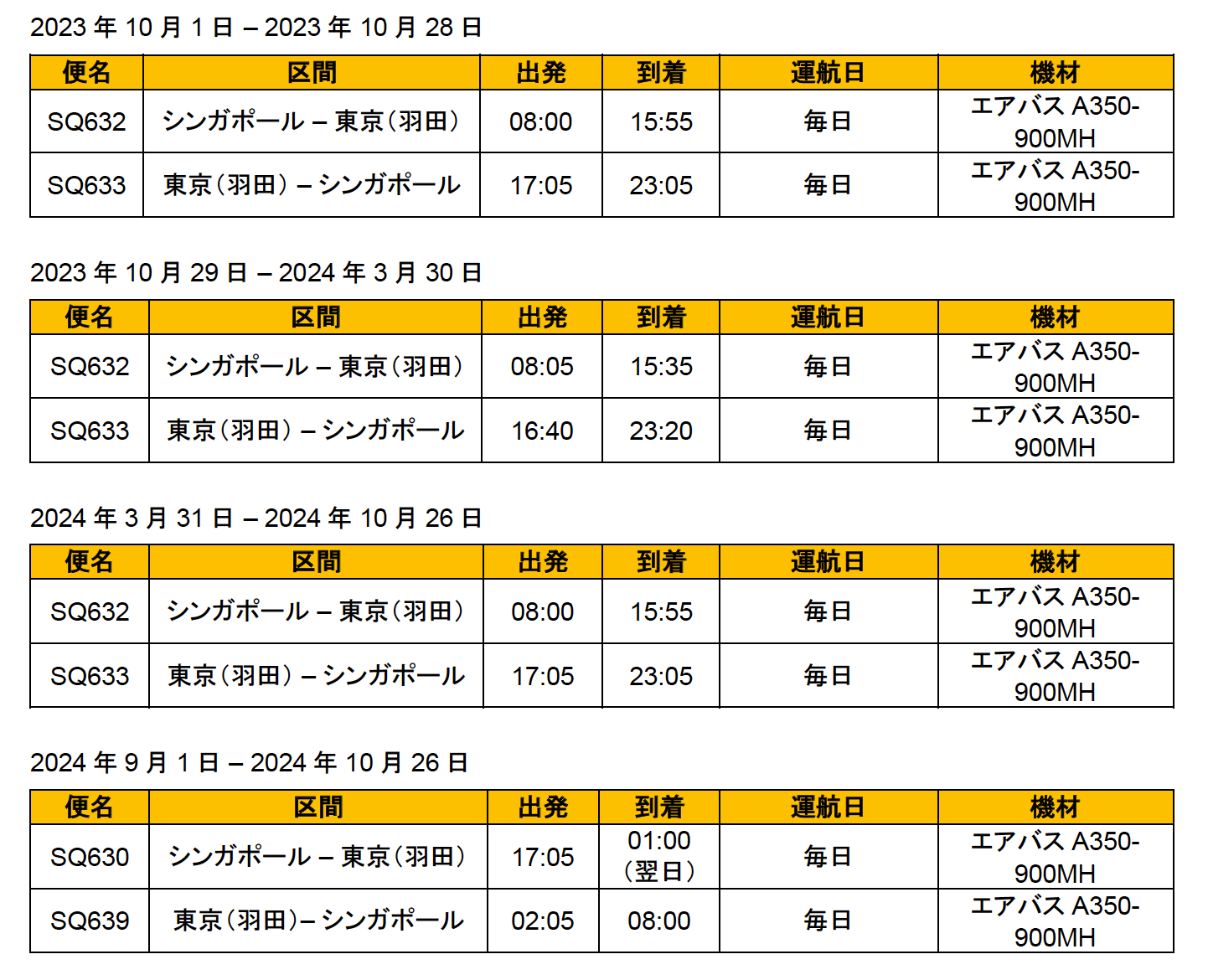 2023年10月1日より、シンガポール – 東京(羽田)間(SQ632便、SQ633便)は、3便目となるデイリー運航便を追加します。2024年9月1日からは、シンガポール – 東京(羽田)間で、デイリー運航便で4便目(SQ630便、SQ639便)となる運航を開始します。どちらの運航もエアバスA350-900中距離(A350-900MH)型機が投入される予定です。これにより、シンガポール – 東京(羽田)間は、現在毎日2便の運航からパンデミック前と同じ毎日4便の運航へと戻ります。
