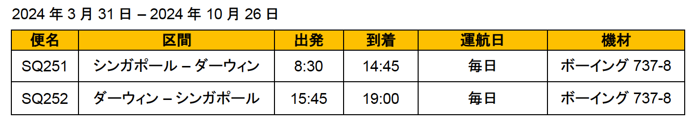 シンガポール – ダーウィン間(SQ251便、SQ252便)は、現在週5便を運航していますが、2024年3月31日より毎日運航します。これによりパンデミック前と同じ運航頻度になる予定です。