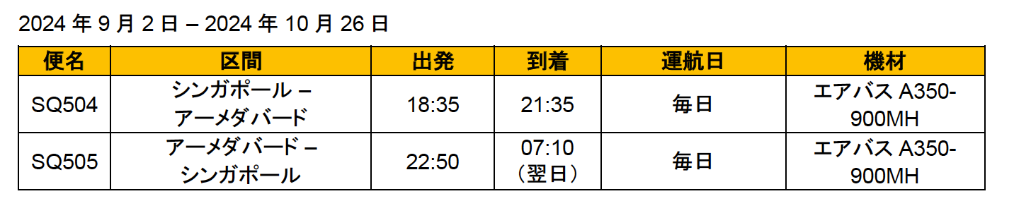 2024年9月2日よりシンガポール – アーメダバード間(SQ504便、SQ505便)をエアバスA350-900中距離(A350-900MH)型機で運航し、これにより週5便からパンデミック前と同じくデイリー運航する予定です。