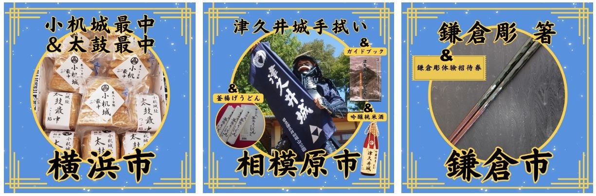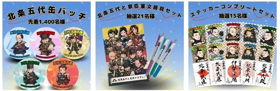 集めたスタンプ数に応じて、1,400名様(各地域100名様)にその場で貰える「北条五代缶バッチ」のほか、北条五代500年に因んで、抽選で合計50名様に当たる「北条五代関連グッズ」や「ゆかりの地の特産品」をご用意しています。