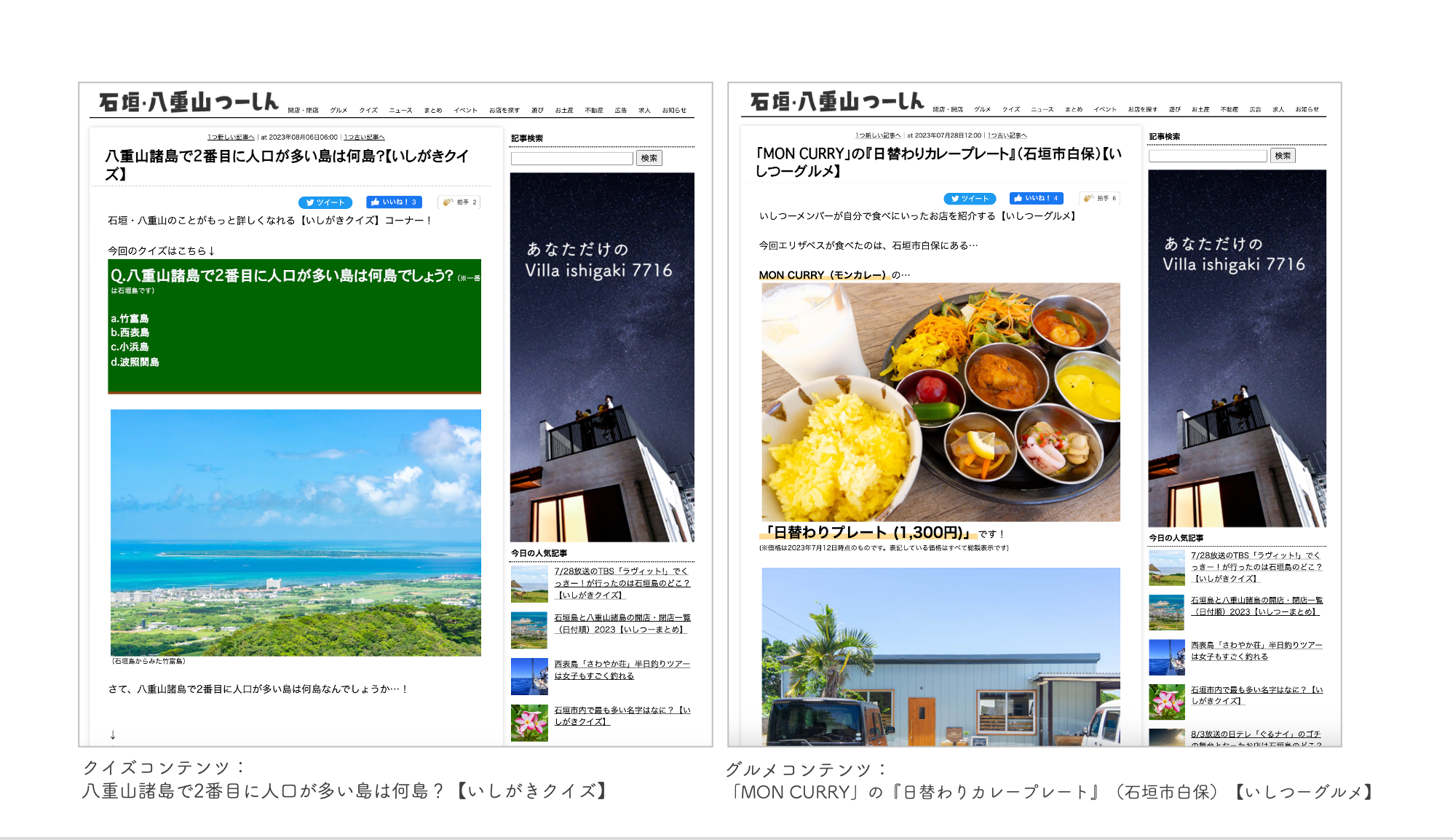 「八重山諸島で2番目に人口が多い島は何島?【いしがきクイズ】」など、はじめて石垣島や八重山に触れる方々の興味を引き出しやすいクイズ形式のコンテンツなども提供することで、知らなかった、へ〜。あっ!知りたいと思ってた!などを提供してきます。