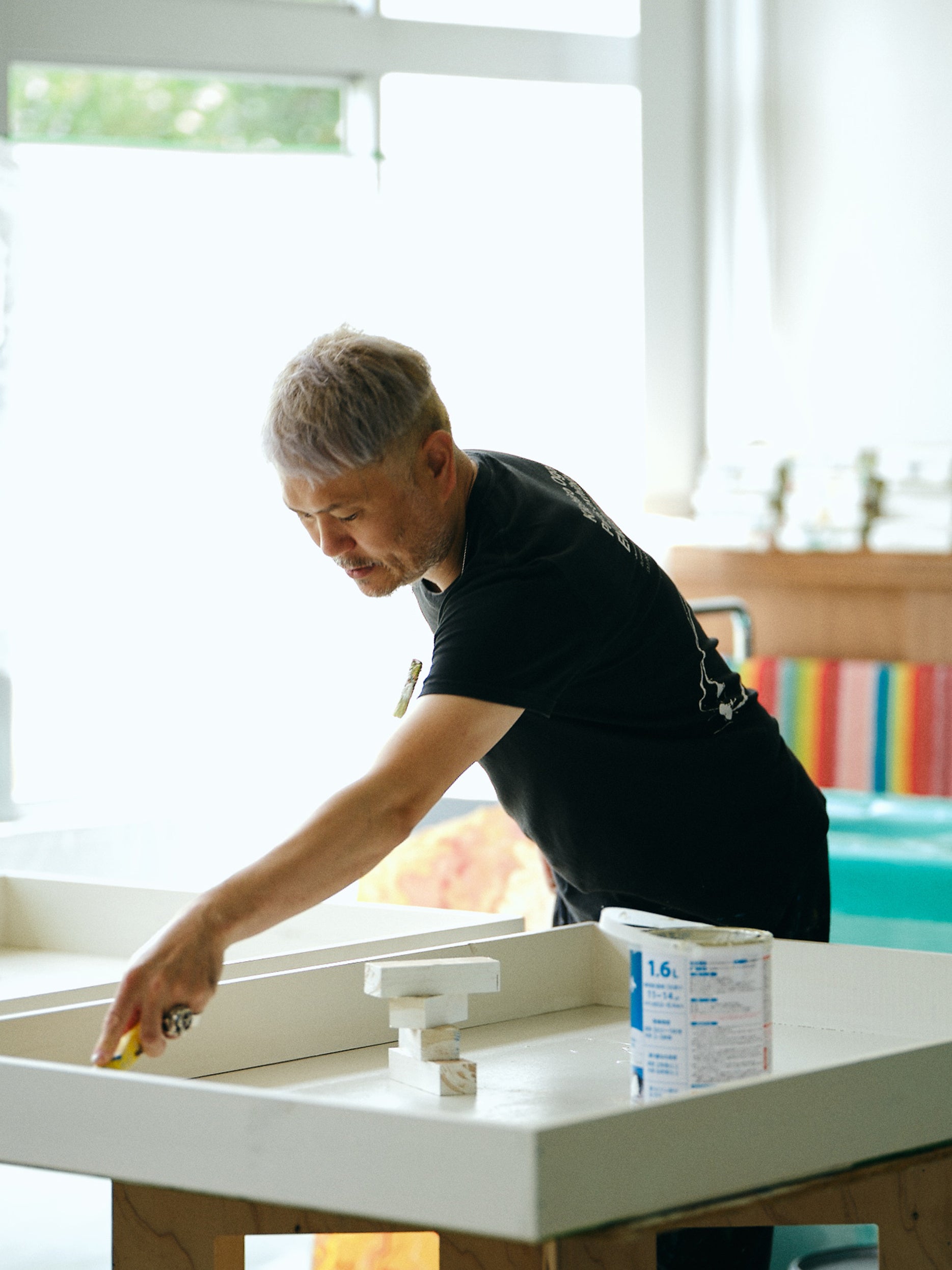 6歳の頃、ロンドンのパンクムーブメントに強烈な影響を受け、洋服に絵を描き始めたのが芸術との出会い。22年間建築の世界に従事し、2017年に芸術家として生きていく覚悟を決め独立。2018年イタリアの高級ブランド、FENDIより世界の5人のアーティストに選出され、マイアミで世界にたった一つのPEEKABOO BAGを発表したことが話題となる。2020年、フランスへ移住。対象物に触れずに一気呵成に描きあげる様子から、その姿は「Paint on the air(空気に描く)」と表現される。作品の多くに見られる、幾重にも重なり合う円相は “GURU-GURU” と呼ばれ、見るものを不思議な世界へと引き込む。