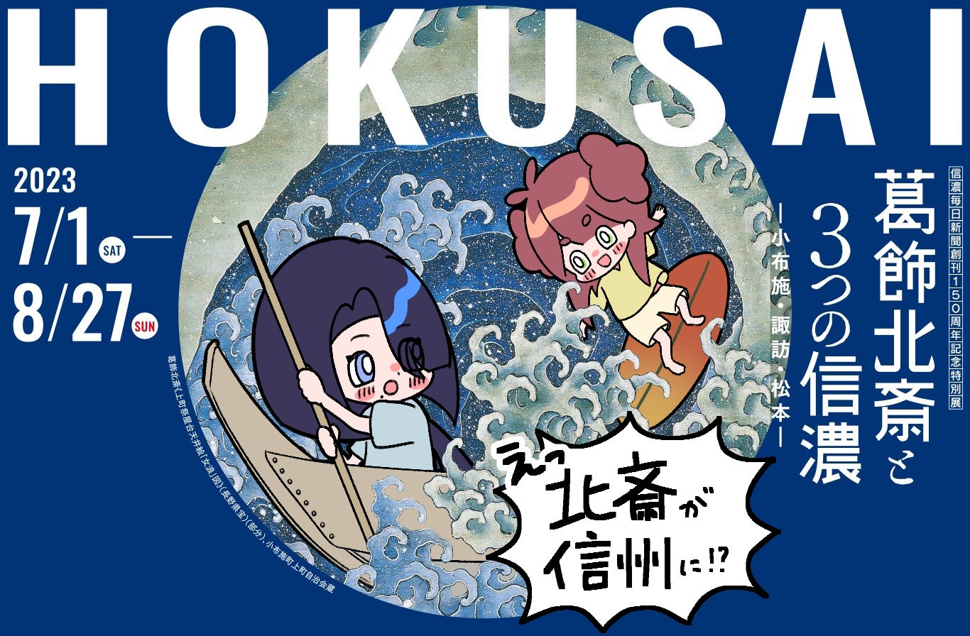 葛飾北斎と信濃の縁を辿る展覧会、信濃毎日新聞創刊150周年記念特別展「葛飾北斎と3つの信濃-小布施・諏訪・松本-」が長野県立美術館で開催中です。この度、信濃毎日新聞デジタルで連載中の4コマ漫画「ここがわからんばい!信州」とのコラボページが公開されました。漫画に登場するキャラクター、真子と美陽が展覧会の魅力を紹介します!