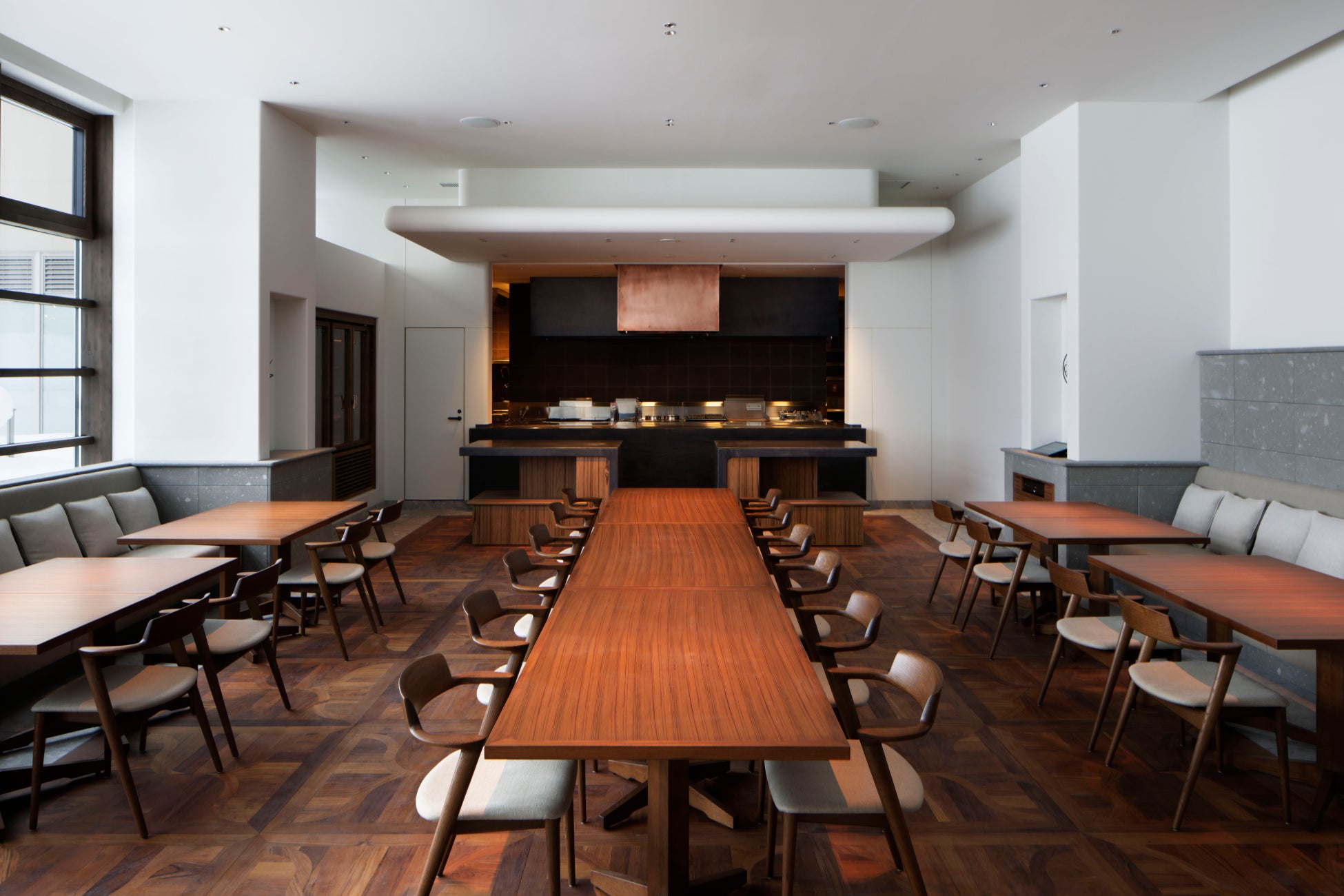 ダイニングではアラカルト、コース、シェフズテーブルが選択可能です。シェアスタイルのお料理から、コーススタイルのお料理まで、さまざまなダイニングシーンに合わせた新解釈による炉端焼プレゼンテーションをお愉しみいただけます。ダイニングの中央には北海道を中心とした旬の食材をディスプレイ。シェフズテーブルではお客様がディスプレイから食材を選び、シェフが目の前のオープンキッチンで北海道が誇る旬の食材をグリルで豪快に焼き上げ、特別な一皿に仕上げます。
