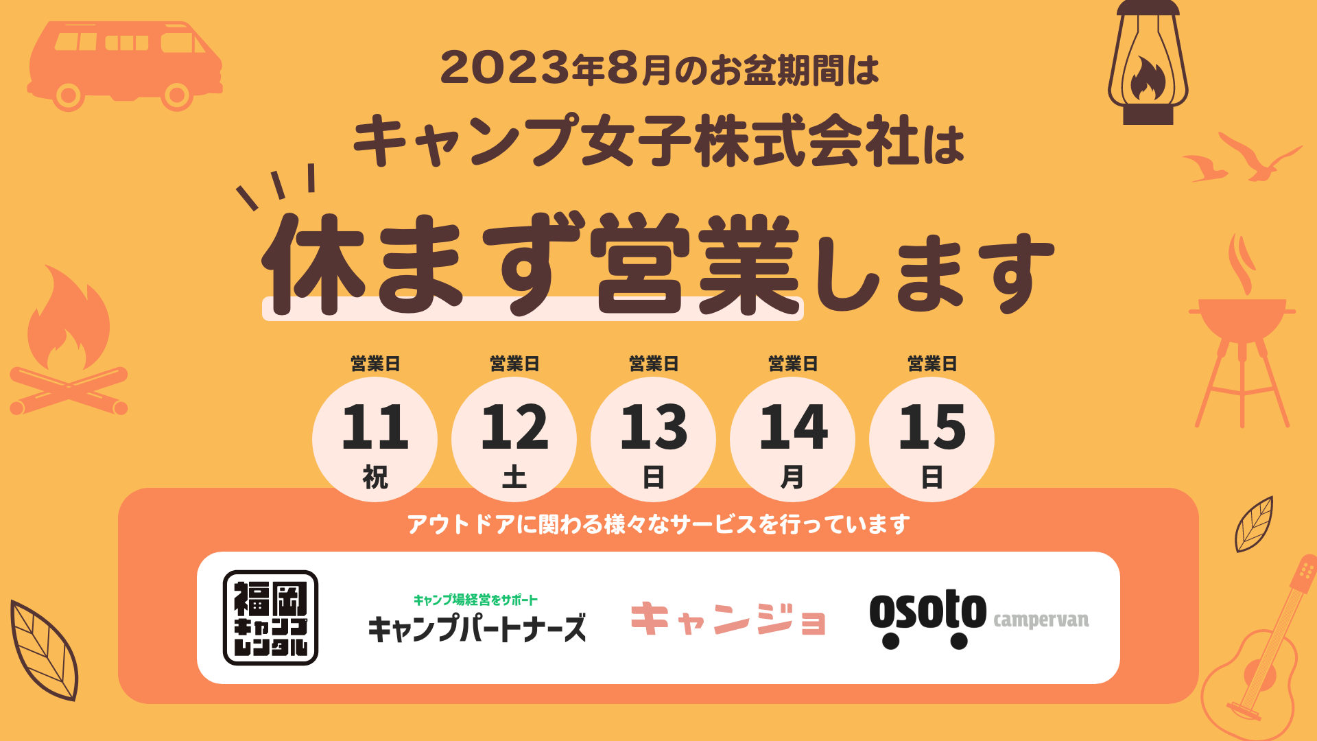 キャンプ女子株式会社では、夏のアウトドアを楽しむ皆様を全力応援するため、下記のアウトドア関連サービスは休まず営業いたします。