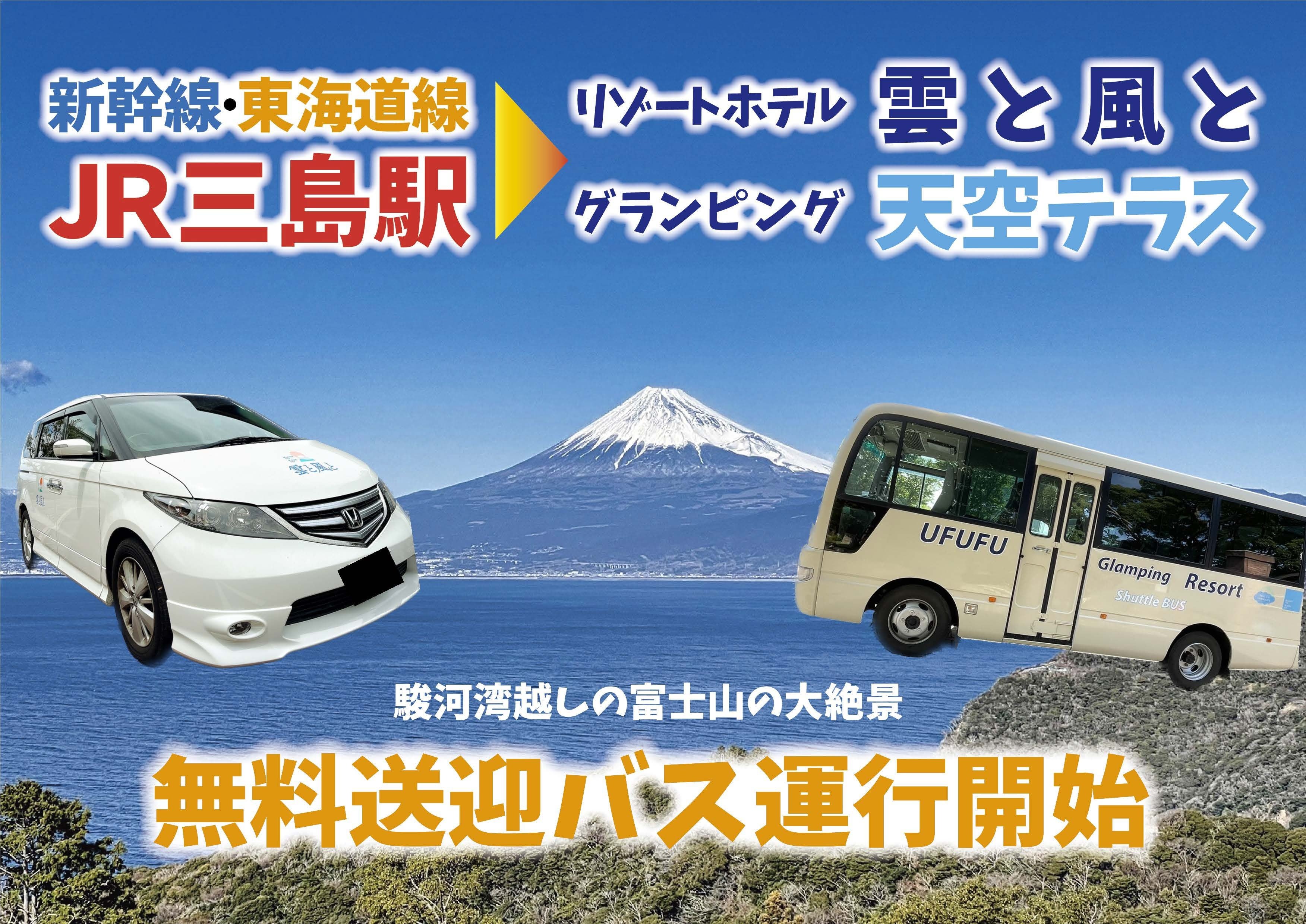 雄大に広がる駿河湾と富士山を見渡す全11室の絶景リゾートホテル「雲と風と」、絶景グランピング「西伊豆 天空テラス」が、JR東海道新幹線の発着駅・三島駅と「雲と風と」「西伊豆 天空テラス」を結ぶ無料送迎サービスを8月1日より開始いたしました。