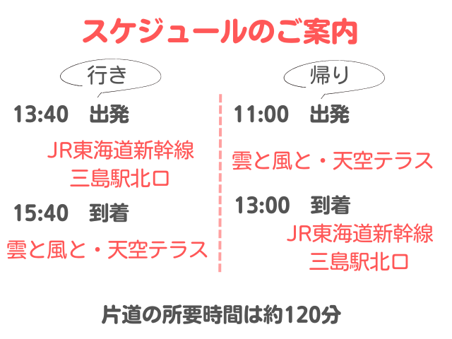 公共交通機関でお越しの場合、通常三島駅⇔施設最寄りバス停までの運賃が3,000円以上必要ですが、無料で、また、乗り換えの手間が無く施設までお越しいただけます。