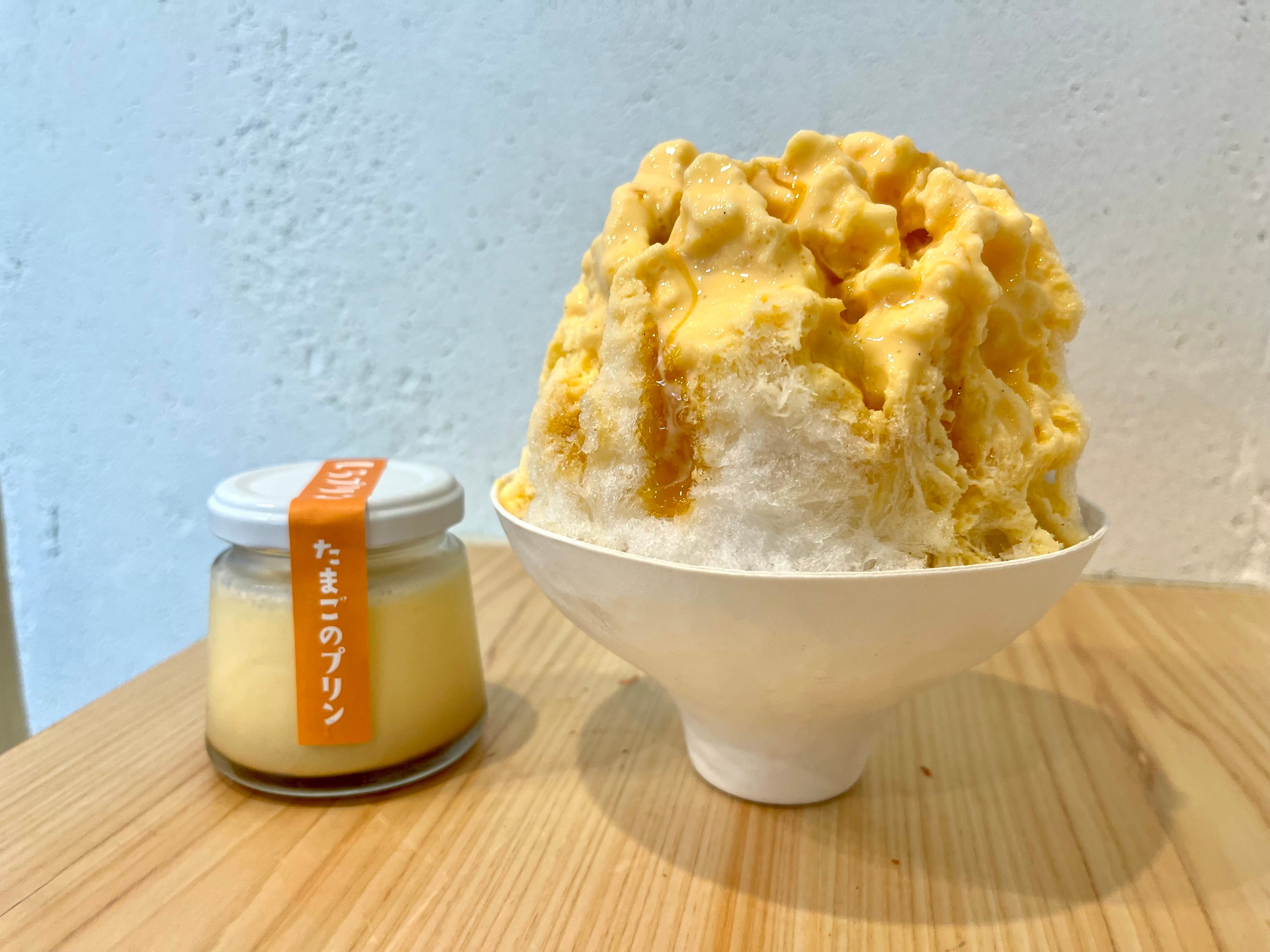 かき氷の中に卵をしっかり使用した「たまごプリン」が丸々1個入っており、氷の上には卵や牛乳、砂糖、バニラエッセンスで作ったプリンソース、キャラメルソースがたっぷりかかっています。中にも外にも贅沢にプリンを使ったプリン専門店でしか食べられないかき氷です。(商品価格:800円 / 税込み)
