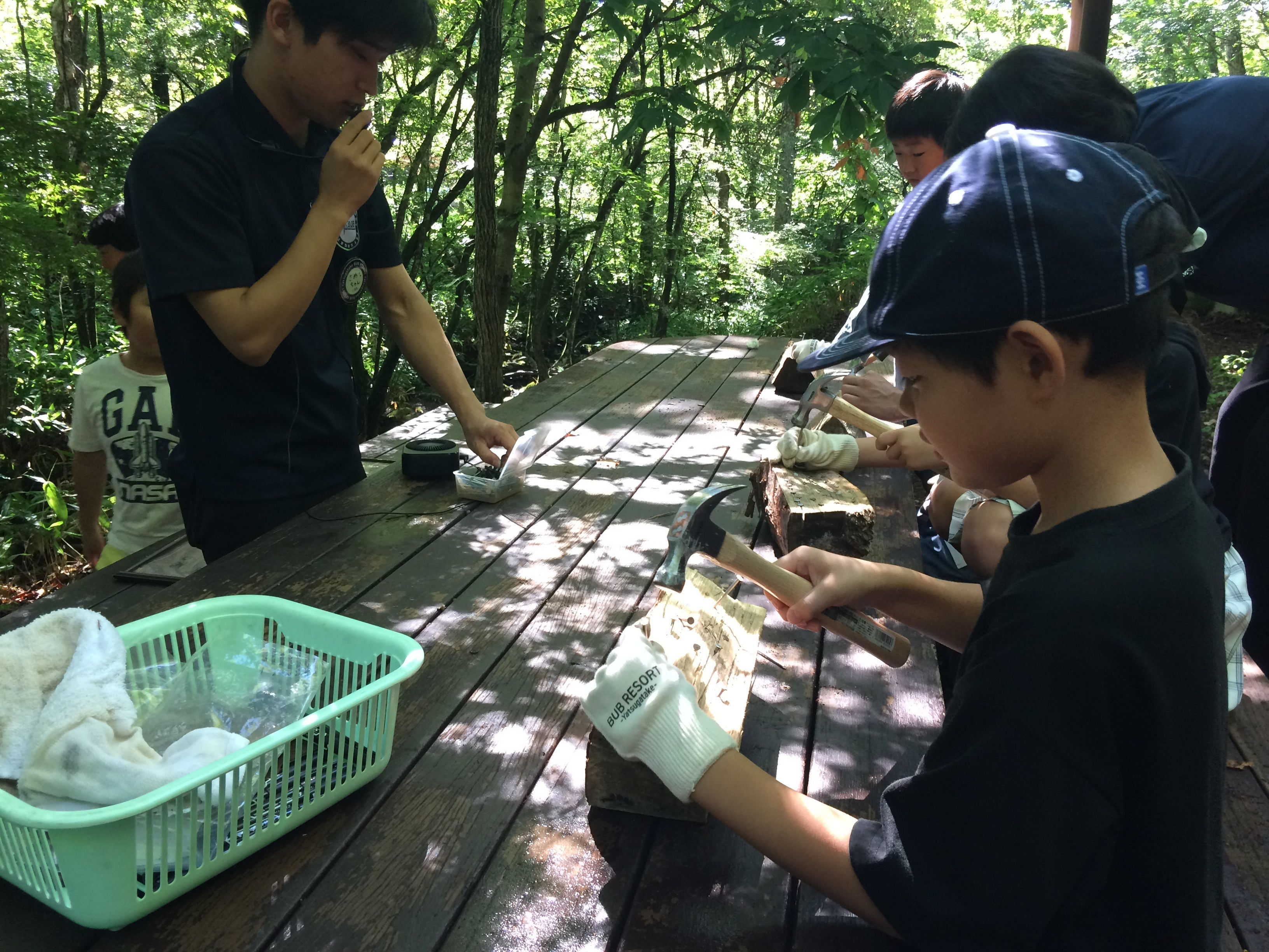 子供たちには、大工の基本である釘打ちの技術を体験していただきます。BUBクルー(スタッフ)のもと、安全にハンマーを使って実際に釘を打つ作業を体験します。