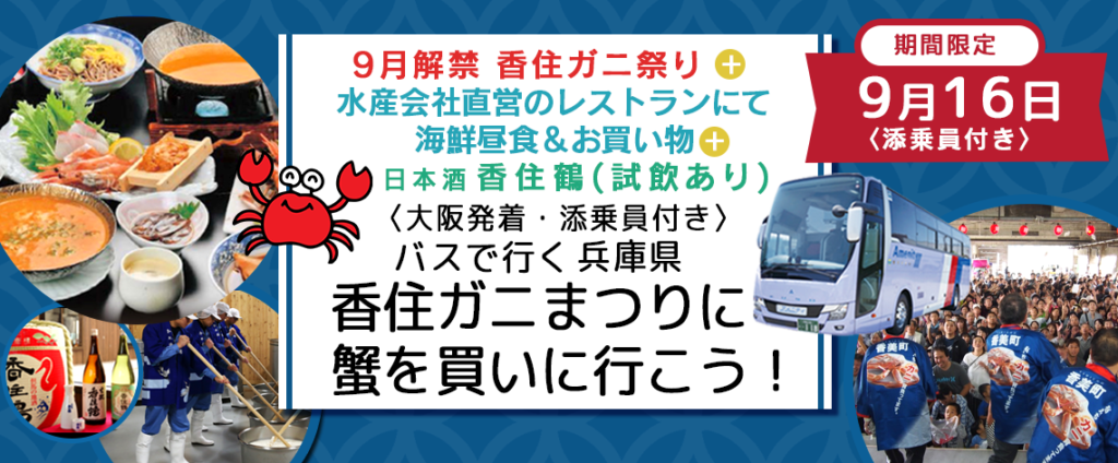 10席増席!9月16日(土) おひとり様¥11,800-《香住ガニまつり》〈大阪駅・天満橋発着・添乗員付き〉香住ガニ祭り・海鮮うにしゃぶ鍋昼食・地元の農作物やお酒をお買い物 バスで行く日帰りプラン