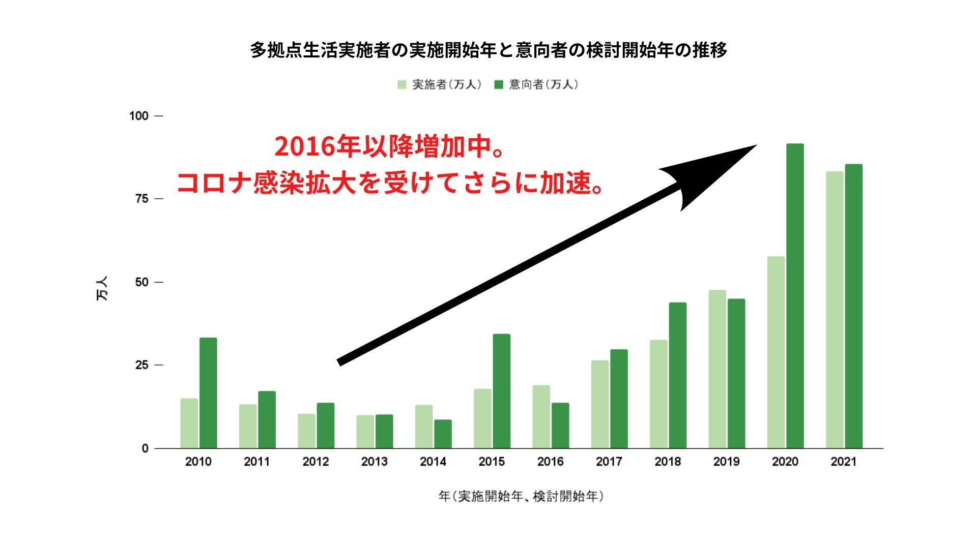 近年「多拠点生活」「二拠点生活」といった言葉を聞く回数が増えており、「多拠点生活」という自由なライフスタイルへの興味関心が集まっています。それと同時に多拠点生活の実現をサポートするサービスも多く生まれています。
